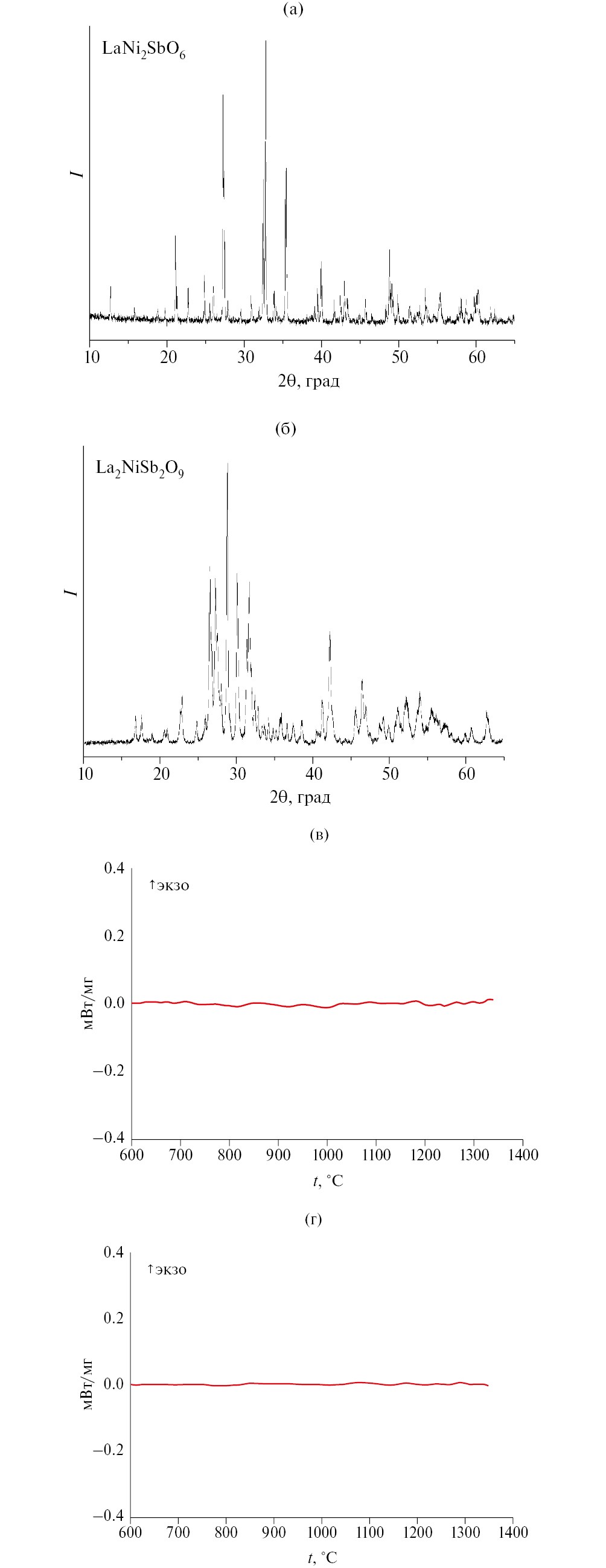 Рис. 3. Дифрактограммы (а, б) и ДСК-кривые нагревания (в, г) тройных оксидов LaNi2SbO6 (а, в) и La2NiSb2O9 (б, г)