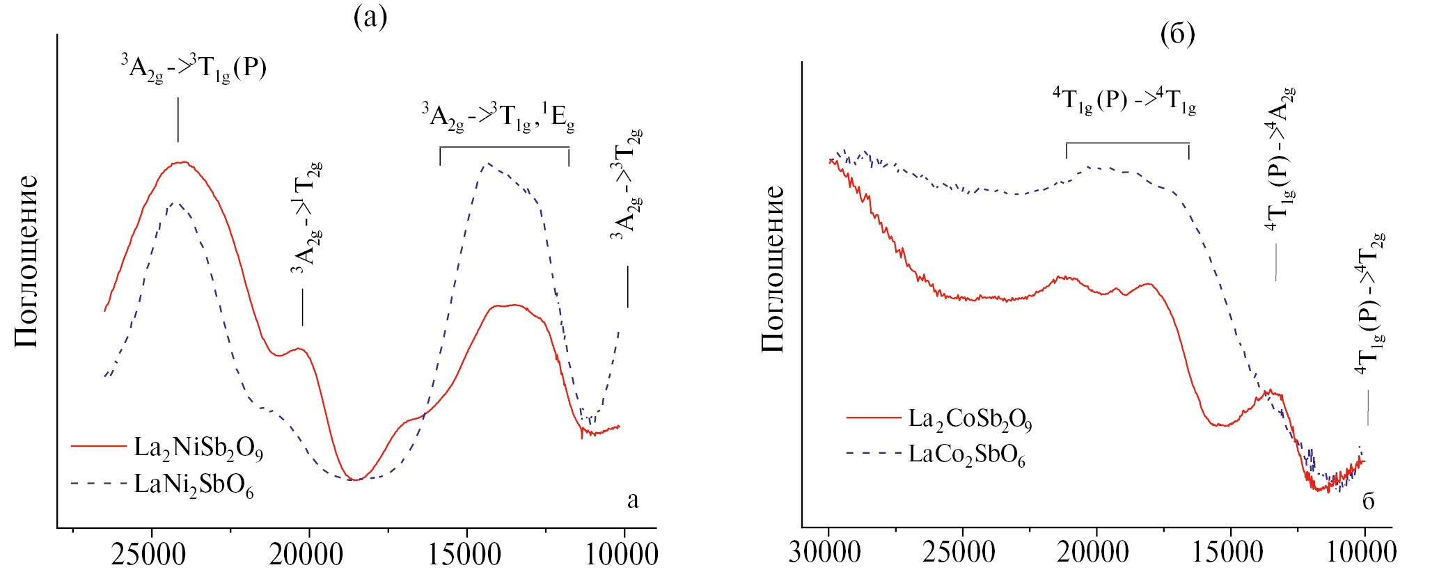 Оптические спектры (рис. 7) диффузного отражения впервые полученных фаз подтвердили, что никель и кобальт находятся в них в степени окисления +2. Известно [51], что в спектре октаэдрически координированного Ni2+ наблюдаются три разрешенных d–d-перехода с основного уровня 3A2g на 3T2g, 3T1g и 3T1g(P). В оксидах соответствующие этим переходам полосы наблюдаются в диапазонах 7000–10 000, 12 000–16 000 и 22 000–27 000 см–1. Возможно также наблюдение полос, связанных с запрещенными по спину переходами 3A2g → 1Eg и 3A2g → 1T2g. Состояния 1Eg и 3T1g по энергиям близки. В результате спин-орбитального взаимодействия интенсивность запрещенного перехода 3A2g → 1Eg возрастает за счет разрешенного, поэтому в спектрах Ni2+ в области 12 000–16 000 см–1 наблюдается дублет. Запрещенный по спину переход 3A2g → → 1T2g обычно наблюдается в виде слабой полосы с длинноволнового края перехода 3A2g → 3T1g. Как видно из рис. 7, в спектрах LaNi2SbO6, La2NiSb2O9 и LaNi1/3Sb5/3O6 наблюдаются все перечисленные особенности. LaNi1/3Sb5/3O6 приведен в качестве образца сравнения. Это указывает на то, что в этих соединениях ионы никеля присутствуют в степени окисления +2.
