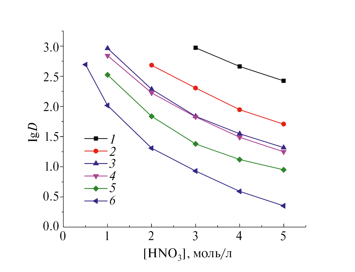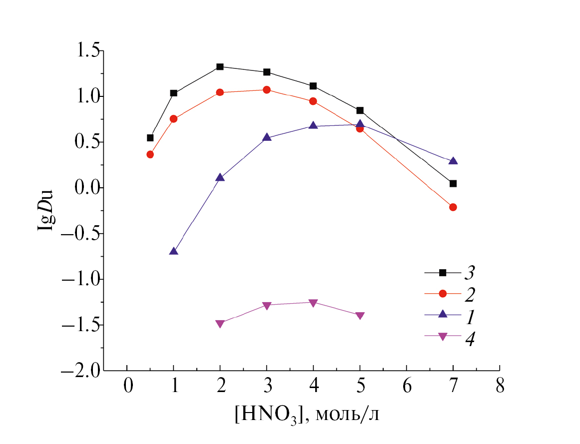 Содержание U(VI), Th(IV) и лантанидов(III) в исходных и равновесных водных растворах определяли методом масс-спектрометрии с ионизацией пробы в индуктивно связанной плазме с использованием масс-спектрометра XSeriesII (ThermoScientific, США), содержание элементов в органической фазе – по разнице концентраций в водном растворе до и после экстракции. В тех случаях, когда эта разница была <10%, содержание элементов в органической фазе определяли после реэкстракции 0.1 М раствором оксиэтилидендифосфоновой кислоты. Коэффициенты распределения элементов рассчитывали как отношение их концентраций в равновесных фазах. Не менее трех параллельных опытов проводили при определении коэффициентов распределения. Погрешность их определения не превышала 10%. Концентрацию HNO3 в равновесных водных фазах определяли потенциометрическим титрованием 0.1 М раствором NaOH.