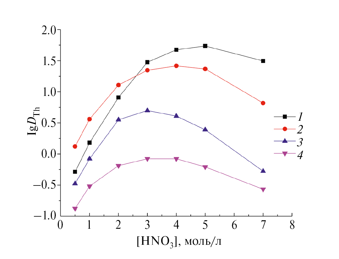 При экстракции Th(IV) из 3 М растворов HNO3 величины DTh возрастают в ряду экстрагентов 4 < < 3 < 2 < 1 (рис. 2). Замена двух циклогексильных заместителей в лиганде 3 на фенильные сопровождается увеличением DTh, при этом отношение DTh(1)/DTh(3) увеличивается от 1.3 до 60 с ростом концентрации HNO3 в водной фазе от 0.5 до 7 моль/л. Это свидетельствует о проявлении ЭАУ в указанной системе. При замене одного фенильного заместителя в лиганде 1 на метильный наблюдается увеличение DTh при экстракции соединением 2 в диапазоне концентраций HNO3 0.5–2 моль/л и лишь при [HNO3] > 3 моль/л DTh(1) > DTh(2) (рис. 2).