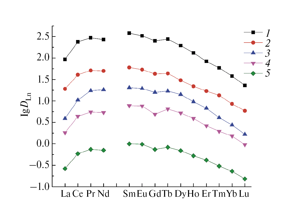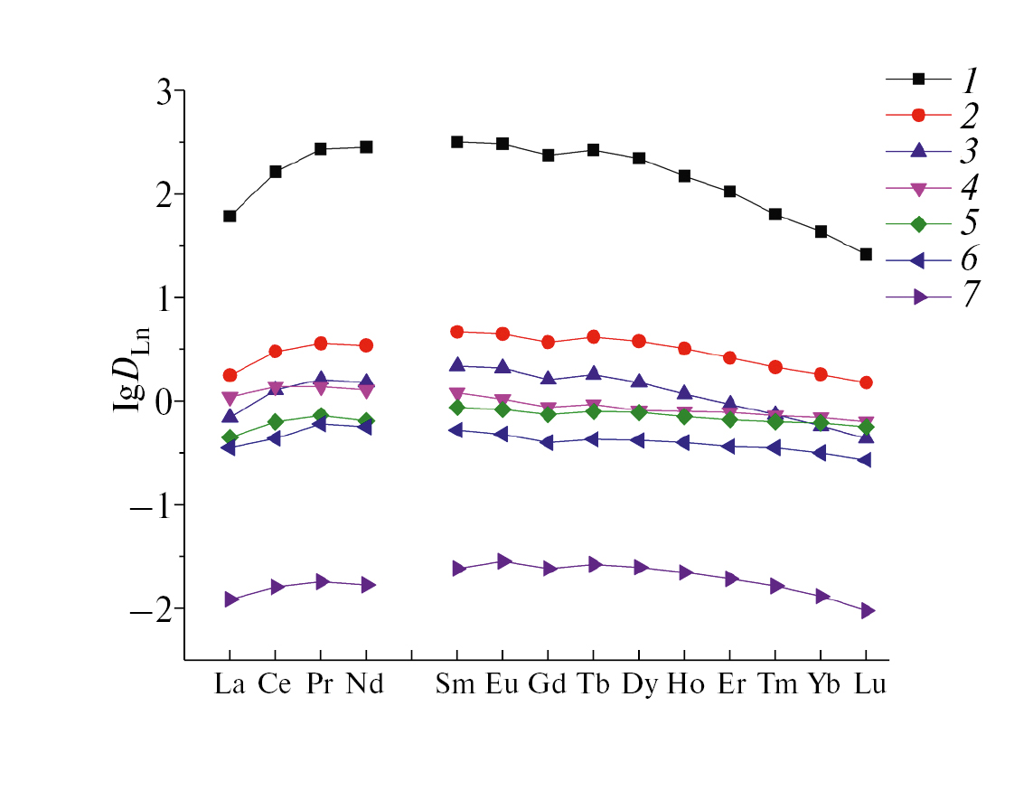Эффективность экстракции Ln(III) соединениями 1–4 возрастает от La(III) к Sm(III), а затем снижается с увеличением атомного номера лантанида (Z) (рис. 4, табл. S1). Аналогичный характер зависимости lgDLn–Z наблюдался при экстракции Ln(III) из азотнокислых растворов растворами КМФО, что связано с увеличением энергии гидратации ионов Ln3+ с увеличением Z [31].