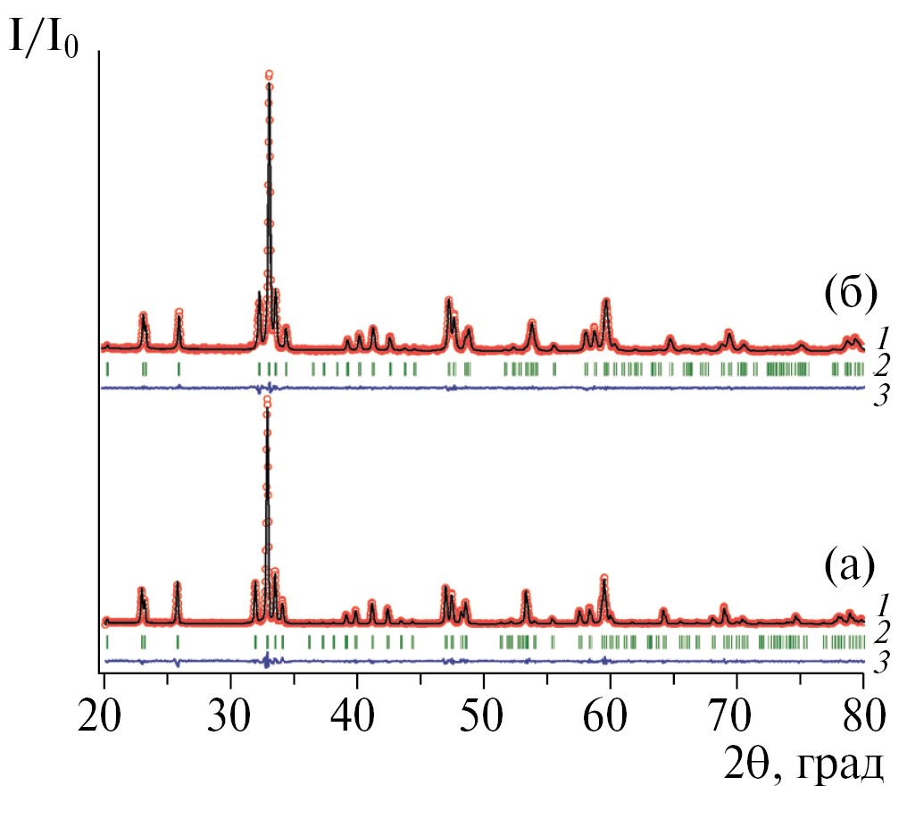 Рис. 1. Рентгенографические данные для Gd1–xSrxCo0.2Fe0.8O3–δ, где x = 0.0 (а), x = 0.1 (б), обработанные по методу Ритвельда. Точки – данные эксперимента, 1 – теоретический спектр; 2 – местоположение максимумов с разрешенным набором индексов Миллера (hkl); 3 – разница между экспериментальными данными и теоретической кривой