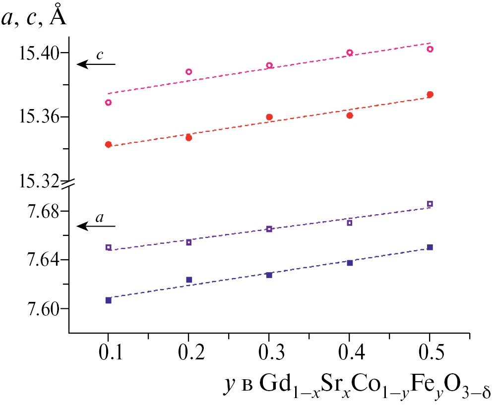 Для сравнения параметров элементарных ячеек оксидов Gd1–xSrxCo1–yFeyO3–δ (x = 0.6 и 0.7) во всем интервале концентраций (0.1 ≤ y ≤ 0.9) параметры тетрагональной суперъячейки были пересчитаны на псевдокубическую по формуле: