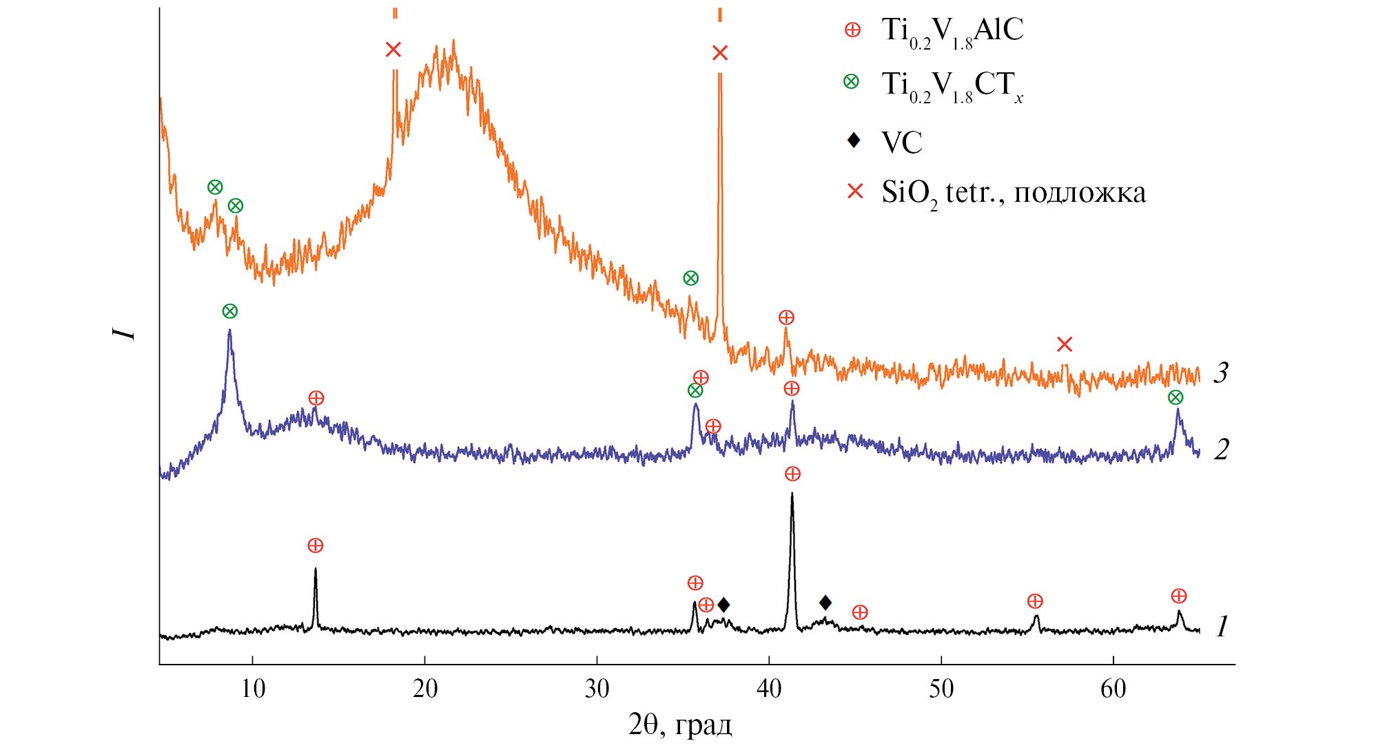 Синтез исходной MAX-фазы Ti0.2V1.8AlC проводили по известной методике, описанной в работах [33, 56, 60]. Мольное соотношение n(V) : n(Ti) : n(Al) : n(C) составляло 1.8 : 0.2 : 1.2 : 1.8, отношение m(V+Ti+Al+C) : m(KBr) = 1 : 1, температура термической обработки в среде аргона – 1100°С, длительность – 5 ч. Получение индивидуального многослойного (аккордеоноподобного) максена Ti0.2V1.8CTx осуществляли с использованием смеси концентрированных плавиковой и соляной кислот в объемном соотношении 3 : 2 при температуре 90 ± 2°С в течение 5 сут [35, 49, 56]. После выделения и промывки с помощью центрифугирования порошок максена сушили в вакууме при ~80°С.
