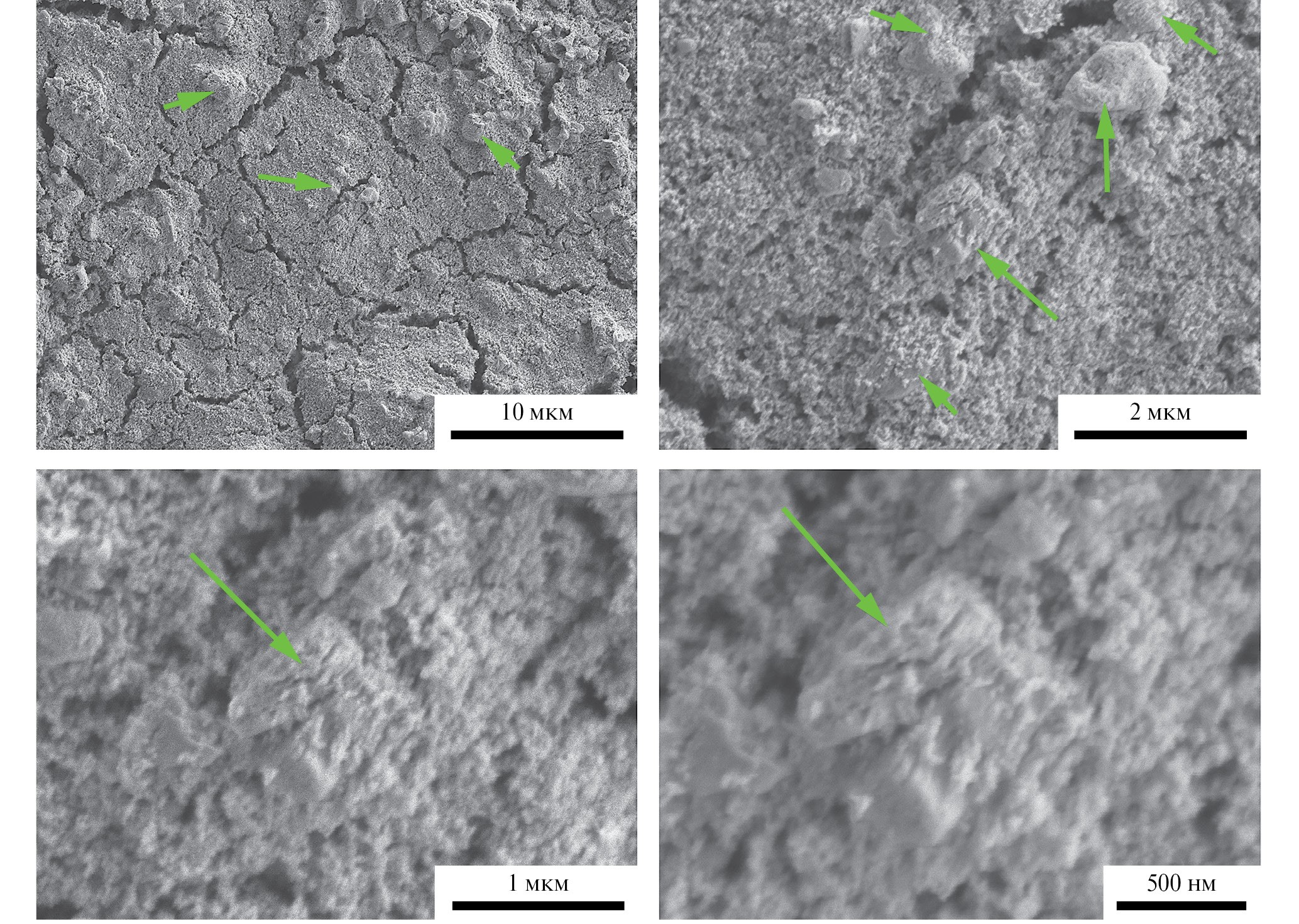 Рис. 4. Микроструктура покрытия Ti0.2V1.8CTx–SnO2 после его окисления при температуре 300°С и образования состава Ti0.2V1.8CTx–V2O5–SnO2 по данным РЭМ. Стрелками обозначены агрегаты многослойного максена в составе материалов
