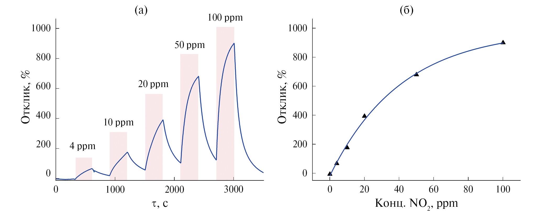 Более подробно изучена чувствительность полученного композиционного материала Ti0.2V1.8CTx–V2O5–SnO2 по отношению к различным концентрациям NO2 (4–100 ppm) при рабочей температуре 200°С (рис. 6). Показано, что при таком увеличении концентрации диоксида азота происходит повышение откликов от 74 до 873% соответственно. Такие величины откликов существенно выше, чем было установлено нами ранее для композиционного материала Ti0.2V1.8CTx–V2O5, для которого отклик на 100 ppm NO2 при рабочей температуре 200°С составил ~200% [56]. Вероятно, это стало возможным благодаря более высокой удельной площади поверхности нанокомпозита Ti0.2V1.8CTx–V2O5–SnO2, в котором частицы диоксида олова приводят к увеличению расстояния между стопками пластин максена в агрегатах и препятствуют их повторному слипанию в ходе формирования покрытия и его сушки. Кроме того, для полученного в настоящей работе состава Ti0.2V1.8CTx–V2O5–SnO2 отмечается слишком высокое сопротивление при комнатной температуре, которое не позволяет изучить его хемосенсорные свойства. Данный факт может быть связан с формированием барьеров Шоттки на более многочисленных границах раздела фаз.