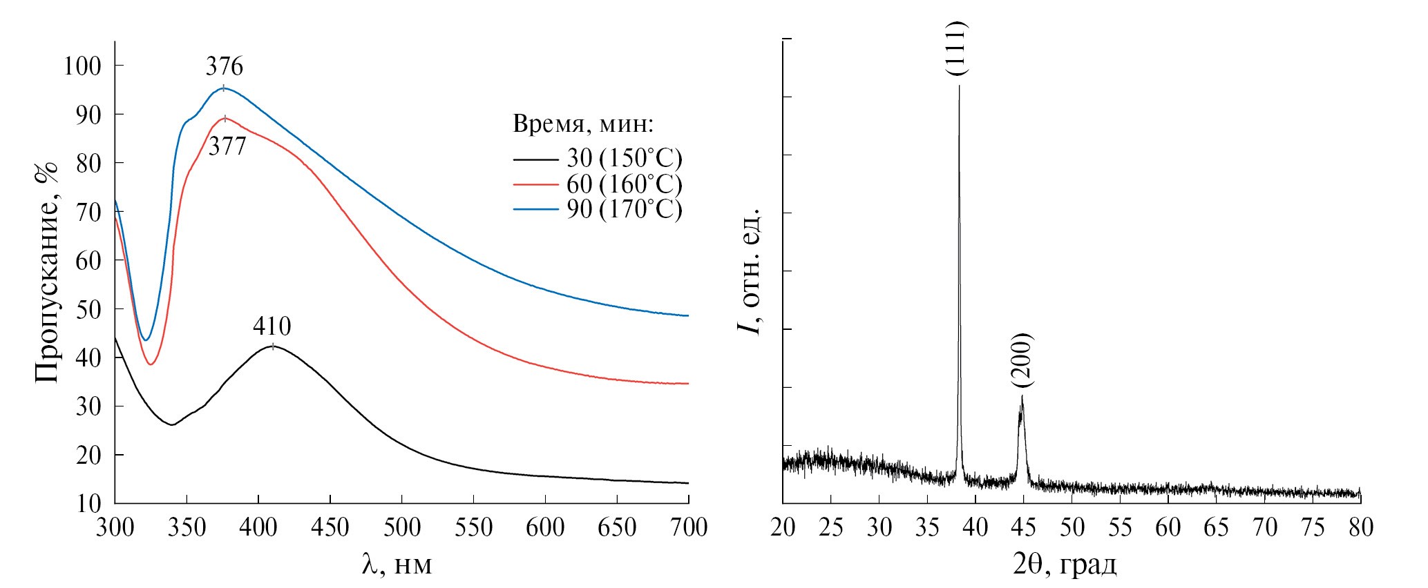Для оценки оптических характеристик формируемых серебряных наноструктур использовали УФ-Вид-спектрофотометр СФ-56 (ОКБ “Спектр”), регистрируя спектры поглощения разбавленных в 50 раз дистиллированной водой проб, отбираемых через каждые 30 мин термообработки реакционной системы. Cпектры записывали в интервале длин волн 300–700 нм с разрешением 1 нм с использованием кварцевой кюветы толщиной 10 мм.
