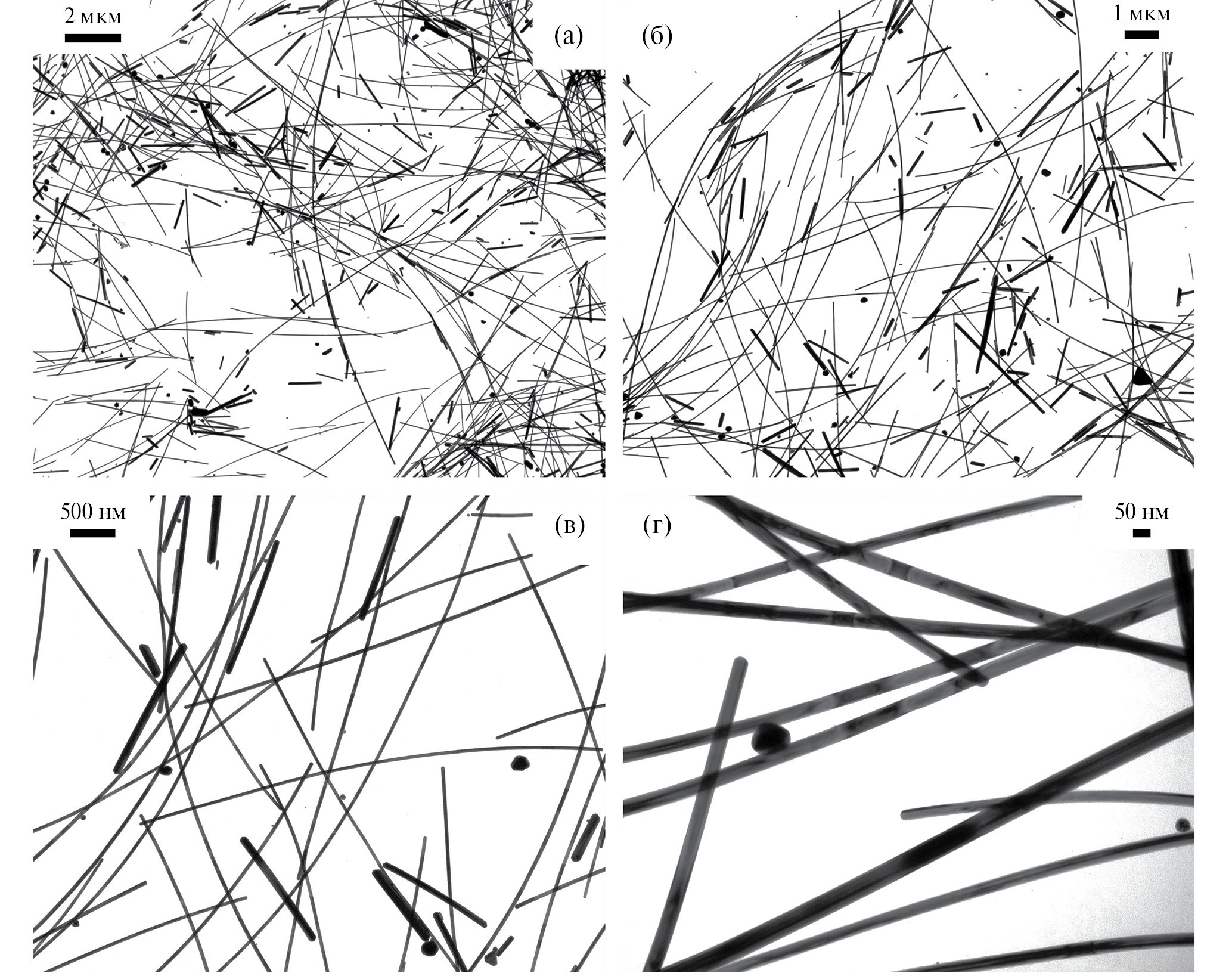 Для более подробного анализа микроструктуры полученного материала использовали ПЭМ (рис. 3), ее результаты хорошо согласуются с данными РЭМ, в частности, образовавшиеся серебряные нанопроволоки в среднем имеют длину ~10–15 мкм, но встречаются и более длинные структуры (длиной до 20 мкм). Также в составе материала наблюдается некоторое количество микростержней длиной 1–3 мкм, диаметр которых увеличивается от 70 до 150 нм при уменьшении длины (рис. 3б, 3в). В меньшем количестве встречается примесь из нульмерных частиц, представляющих собой полиэдры различной сложности. Указанные примесные структуры (микростержни и нульмерные частицы) могут быть отделены от основной части серебряных нанопроволок путем фракционирования с целью достижения более высокой прозрачности соответствующих токопроводящих пленок. Результаты ПЭМ позволили более точно определить диаметр сформированных Ag-НП (рис. 3 г). Видно, что основное количество одномерных наноструктур характеризуется диаметром 35–45 нм, это подтверждают данные РЭМ и УФ-Вид-спектрофотометрии. Кроме того, результаты ПЭМ наглядно свидетельствуют о том, что Ag-НП имеют ограненные боковые поверхности, как это наблюдалось при изучении их микроструктуры методом РЭМ.