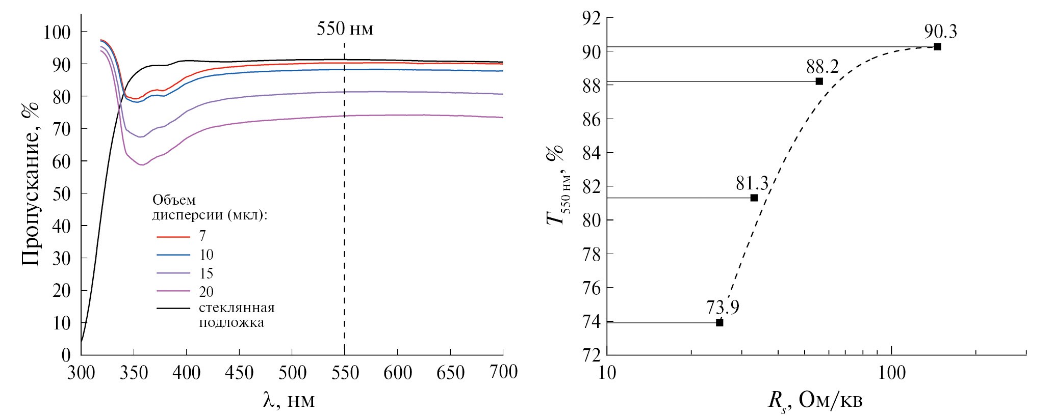 Оптические свойства пленок на основе полученных серебряных нанопроволок, нанесенных капельным методом на поверхность стеклянных подложек, были изучены с применением УФ-Вид-спектрофотометрии (рис. 5а). Для используемых стеклянных подложек при уменьшении длины волны излучения <350 нм существенно растет поглощение, что характерно для подобных материалов. При этом пропускание при 550 нм для чистой подложки составляет 91.3%. Как видно из спектров, для всех пленок на основе Ag-НП наблюдается характерная полоса поглощения, относящаяся к плазмонному резонансу соответствующих одномерных наноструктур. При увеличении объема дисперсной системы, используемой для формирования пленки, уменьшается пропускание во всем исследуемом диапазоне длин волн. Следует отметить, что максимум основной полосы поглощения при увеличении используемого объема дисперсии заметно смещается в сторону бόльших длин волн – от 352 (для объема дисперсии 7 мкл) до 358 нм (20 мкл). Это же приводит к постепенному снижению пропускания и при 550 нм: 90.3 (7 мкл), 88.2 (10 мкл), 81.3 (15 мкл) и 73.9% (20 мкл). Для полученных таким образом пленок на основе серебряных нанопроволок выполнена оценка поверхностного сопротивления (Rs). Как видно из рис. 5б, увеличение пропускания при 550 нм (T550 нм) сопровождается ростом величины Rs по логарифмическому закону. Так, при T550 нм = 73.9% (объем дисперсной системы 20 мкл) значение поверхностного сопротивления составляет 25 Ом/кв. С ростом пропускания до 81.3% величина Rs также увеличивается, но остается на достаточно низком уровне (33 Ом/кв). Для пленки, характеризующейся пропусканием 88.2%, поверхностное сопротивление растет до 56 Ом/кв, а при T550 нм = 90.3% данный параметр составляет 146 Ом/кв. Указанные результаты по соотношению прозрачности и электропроводности пленок на основе полученных серебряных нанопроволок хорошо согласуются с литературой и свидетельствуют о соответствии указанных характеристик требованиям, предъявляемым к прозрачным токопроводящим пленкам [36].