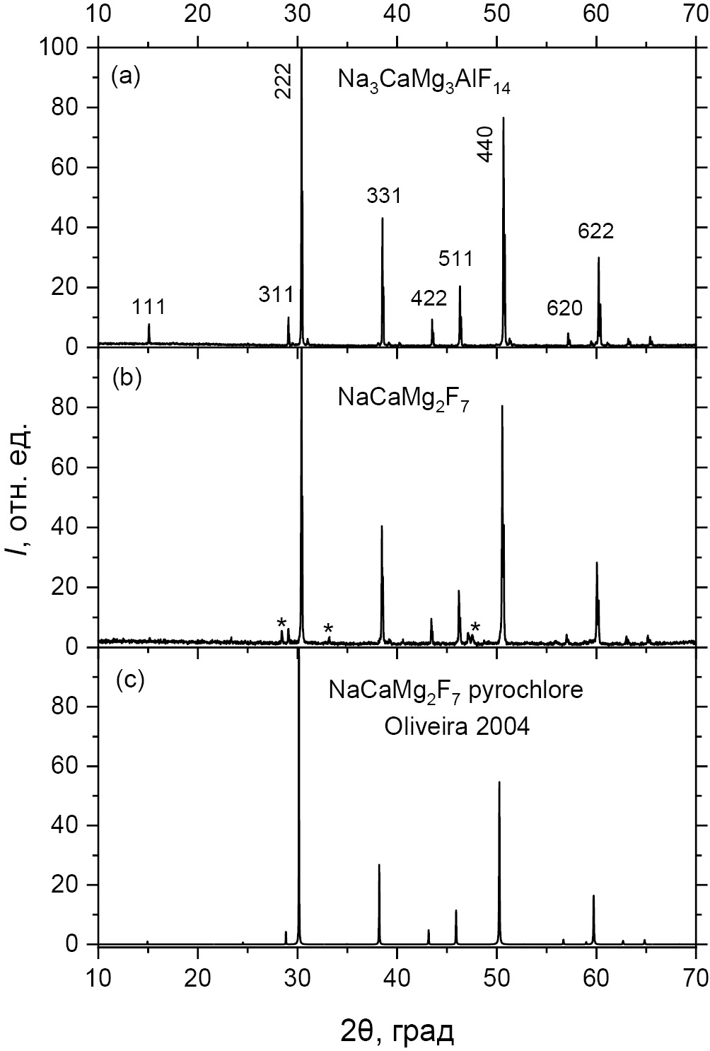 Компоненты в стехиометрических соотношениях смешивали, растирали в агатовой ступке в сухом боксе в атмосфере аргона и прессовали в таблетки. Таблетки переносили в графитовые тигли объемом ~18 см3 с крышками, на дно которых загружали 0.05 г гидрофторида аммония. Графитовые тигли помещали в корундовый тигель большего размера и засыпали древесным углем. Синтез проводили при заданных температурах в течение 4 или 8 ч. Температуру отжига последовательно увеличивали от 500°C. Были найдены оптимальные температуры отжига для получения однофазных образцов Na3CaMg3AlF14 и NaCaMg2F7, которые оказались в диапазоне 750–800°C. Для уменьшения примеси ионов кислорода обычно перед последним отжигом к образцам добавляли 2 мол. % NH4(HF2). Фазовый состав синтезированных образцов контролировали с помощью рентгенодифракционного анализа керамических образцов или их порошков. В случае появления в образцах примесных фаз дополнительно к кубической фазе пирохлора в образцы добавляли соответствующие исходные реактивы с последующим отжигом.