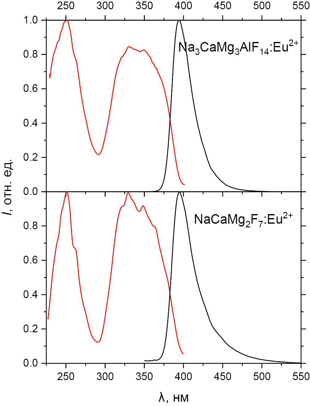 Сравнивая ионные радиусы [15] Na+ (КЧ = 8), Ca2+ (КЧ = 8), Mg2+ (КЧ = 6) и Al3+ (КЧ = 6), равные 1.18, 1.12, 0.72 и 0.535 Å соответственно, с ионными радиусами Eu2+ (1.25 Å для КЧ = 8 и 1.17 Å для КЧ = 6) и Eu3+ (1.066 Å для КЧ = 8 и 0.947 Å для КЧ = 6), можно сделать вывод, что легирующие ионы Eu2+ и Eu3+ могут замещать в структуре фторидов Na3CaMg3AlF14 и NaCaMg2F7 только ионы Na+ и Ca2+. Однако при легировании ионами Eu3+ необходима зарядовая компенсация, механизм которой может быть различным, что потенциально может привести к образованию нескольких Eu3+-центров различного типа. При легировании данных соединений ионами Eu2+ отсутствуют структурные факторы, способные привести к образованию более чем одного типа Eu2+-центров, поскольку в структуре кубического пирохлора имеется только одна кристаллографическая позиция, общая для Na+ и Ca2+ (с КЧ = 8), на которую могут входить легирующие ионы Eu2+.
