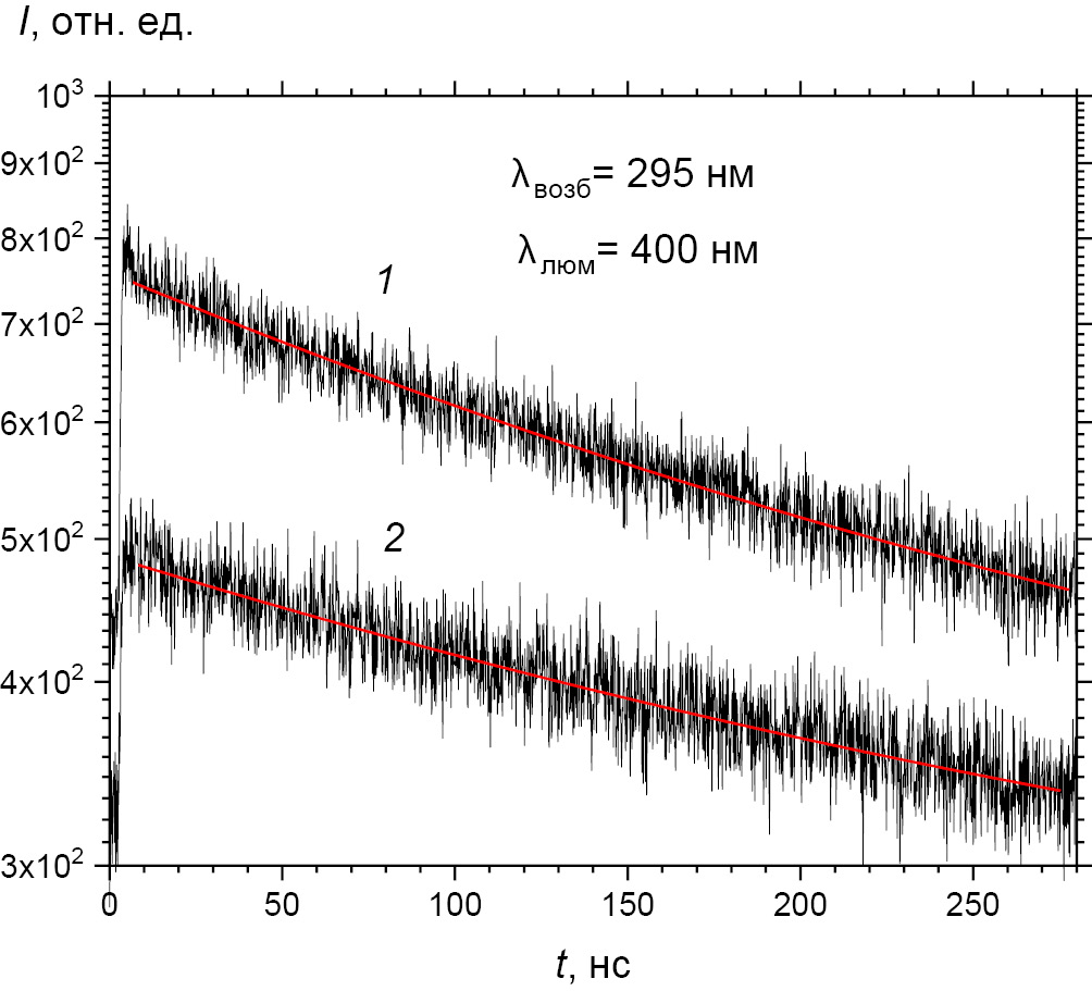 Кинетику затухания люминесценции в наносекундном диапазоне изучали на установке, оснащенной системой коррелированного по времени счета одиночных фотонов (PicoQuant), включающей в себя субнаносекундный импульсный светодиод PLS 290 (длительность импульса 900 пс, пиковая длина волны 295 нм, FWHM <20 нм), управляемый контроллером PDL-800-B, детектор счета фотонов Hamamatsu PMA 182-N-M и компьютерную плату время-цифрового преобразователя TimeHarp 200 с PCI-интерфейсом. Длину волны детектируемой люминесценции выбирали с помощью интерференционных светофильтров. Максимальный временной диапазон, доступный для анализа кинетики люминесценции на данной установке, составляет ~300 нс.