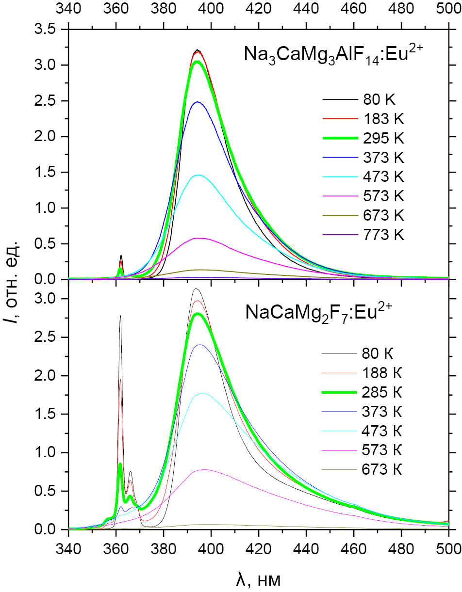 Синтезированные многокомпонентные фториды, легированные Eu2+, демонстрируют хорошую термическую стабильность люминесценции, обусловленной 4f 65d–4f 7-переходами в ионах Eu2+. В частности, температура термического тушения T1/2 люминесценции Na3CaMg3AlF14:Eu2+ (1.0 ат. %) и NaCaMg2F7:Eu2+ (0.5 ат. %) составляет 504 и 543 K соответственно, что может представлять интерес для практического применения люминофоров данного типа в светодиодных источниках света.