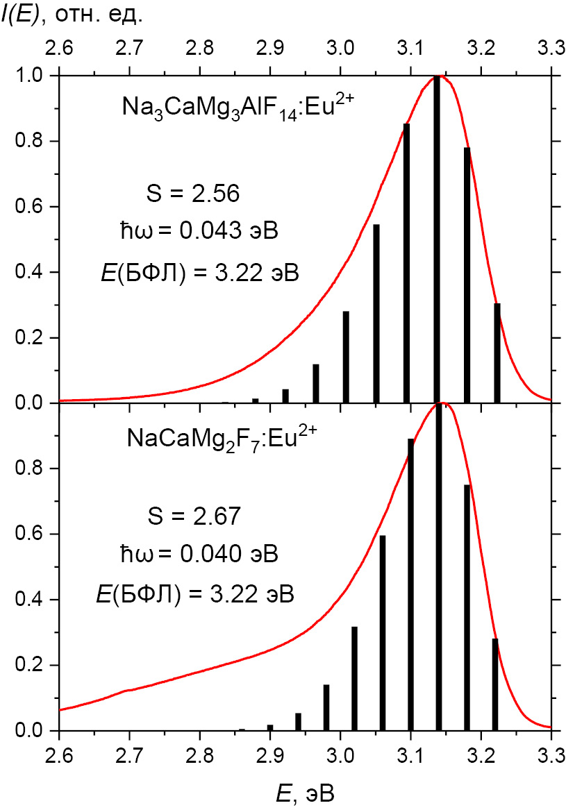 Моделирование спектральной формы полосы 5d–4f-люминесценции ионов Eu2+. В экспериментальных спектрах 5d–4f-люминесценции ионов Eu2+ в синтезированных фторидах не удается идентифицировать бесфононную линию (БФЛ), т.е. в этих системах реализуется случай достаточно сильного электрон-фононного взаимодействия. Спектральное положение БФЛ можно оценить, исходя из общего свойства симметрии форм полос люминесценции и возбуждения люминесценции, а именно: по точке пересечения нормированных спектров ФЛ и ФВЛ, что дает 383.5 (3.233 эВ) и 383 нм (3.237 эВ) для Na3CaMg3AlF14:Eu2+ (1.0 ат. %) и NaCaMg2F7:Eu2+ (0.5 ат. %) соответственно. Удвоенная разность энергии между БФЛ и максимумом полосы люминесценции 4f 65d –4f 7 (8S7/2) дает величину стоксова сдвига (∆S) 0.188 (1520 см–1) и 0.189 мэВ (1523 см–1) соответственно. В случае сильного электрон-фононного взаимодействия выполняются соотношения [17]: