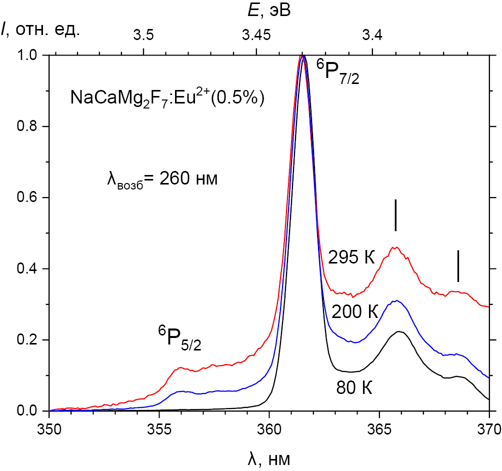 Наблюдаемая относительно низкая интенсивность 4f–4f-люминесценции от ионов Eu2+ на переходе 6P7/28S7/2 может быть обусловлена тем фактом, что коэффициент поглощения на запрещенных по спину переходах 8S7/2–4f 65d (S = 5/2) намного меньше, чем на разрешенных по спину переходах 8S7/2–4f 65d (S = 7/2), и в случае, если данные переходы накладываются друг на друга по энергии, возбуждающие фотоны будут поглощаться в основном на разрешенных по спину переходах. Однако в данных фторидных матрицах спектральная область предполагаемых запрещенных по спину переходов в ионах Eu2+, находящихся в кубическом кристаллическом поле, попадает как раз в область между основными полосами разрешенных по спину переходов, что потенциально увеличивает эффективность поглощения на запрещенных по спину переходах и обеспечивает достаточно высокую для регистрации интенсивность люминесценции на переходе 6P7/28S7/2.