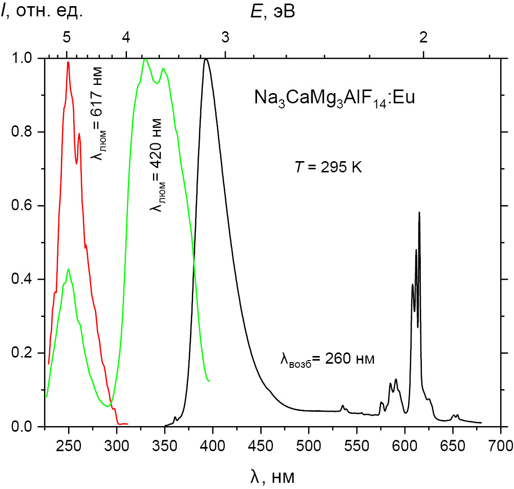 Отжиг керамик, содержащих двухвалентные ионы европия, в атмосфере аргона приводит к частичной конверсии двухвалентного состояния в трехвалентное состояние ионов европия. Такие керамики испускают как 4f 65d–4f 7-люминесценцию ионов Eu2+, так и линейчатую люминесценцию в красной области спектра, обусловленную переходами 4f 7–4f 7 (5D0 → 7FJ) в ионах Eu3+. Однако оба типа люминесценции одновременно эффективно возбуждаются только в области далекого УФ (λ < 300 нм), где спектрально перекрываются полоса с переносом заряда О2ˉ → Eu3+, дающая красную люминесценции Eu3+, и высокоэнергетическая полоса 4f 7 –4f 65d-поглощения ионов Eu2+.