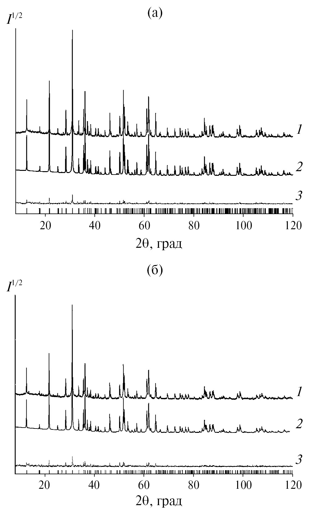Рис. 1. Экспериментальный (1), расчетный (2) и разностный (3) профили рентгенограмм CaYb2Ge4O12 (а) и CaLu2Ge4O12 (б) после уточнения методом Ритвельда; штрихи указывают расчетные положение рефлексов