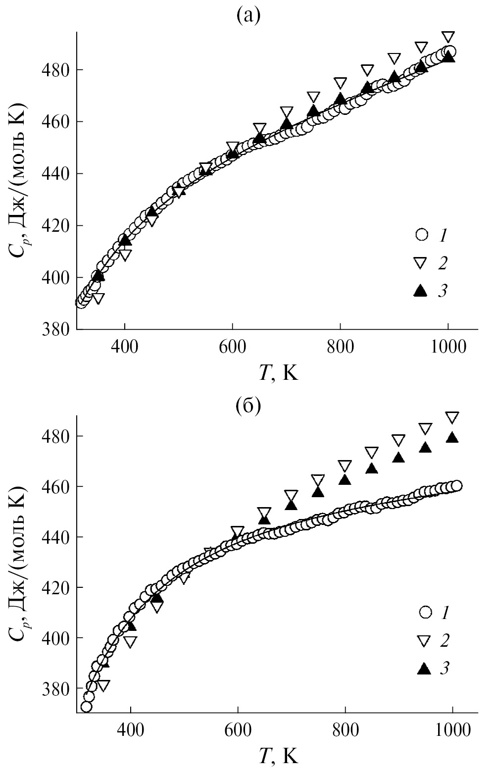 Теплоемкость германатов измеряли методом дифференциальной сканирующей калориметрии по стандартной методике на термоанализаторе STA 449 C Jupiter (Netzsch, Германия). Подробная методика экспериментов описана нами ранее [18]. Измерения проводили на воздухе в динамическом режиме, скорость нагревания составляла 20 град/мин. Ошибка измерения теплоемкости не превышала 2%. Полученные экспериментальные данные аппроксимировали с помощью лицензионного программного инструмента Systat Sigma Plot (Systat Softwere Inc., США).