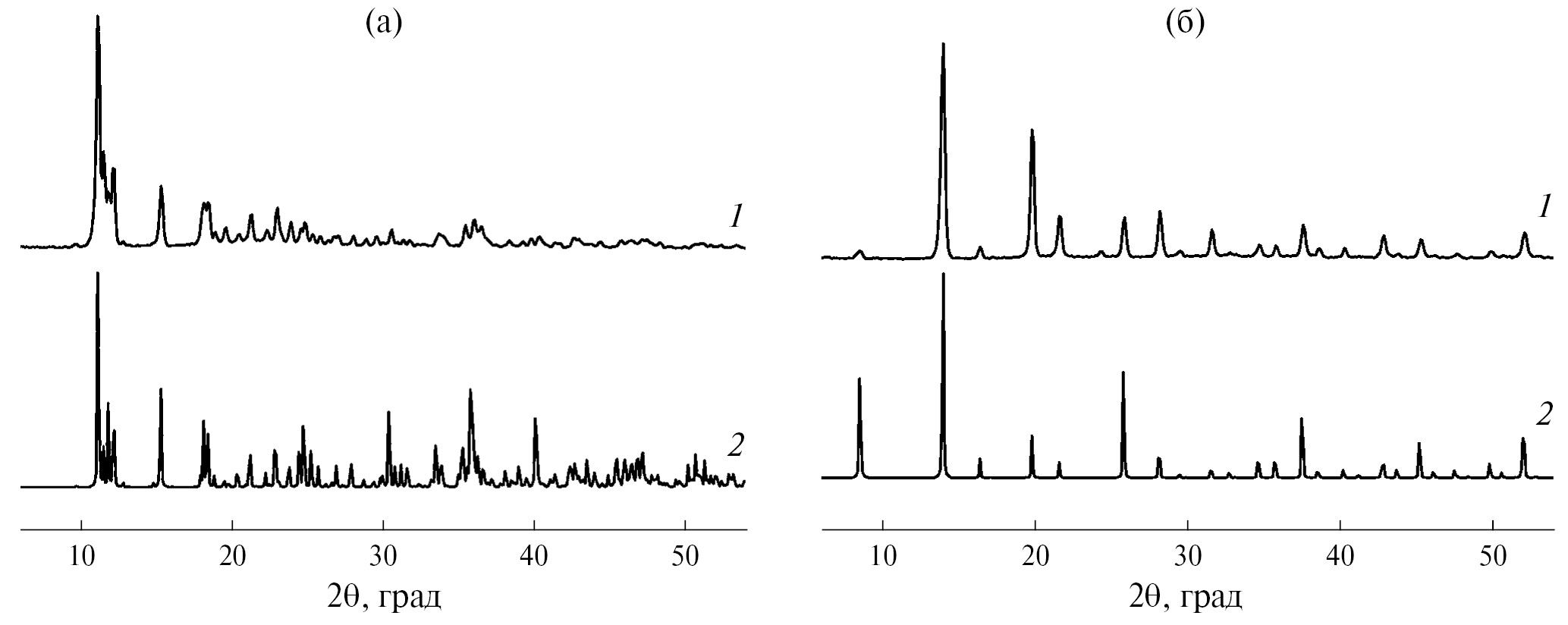 Рис. 1. Расчетные (1) и экспериментальные (2) дифрактограммы для [Cu(im)4][RuNOCl5] (a) и [Ni(im)6][RuNOCl5] · H2O (б)