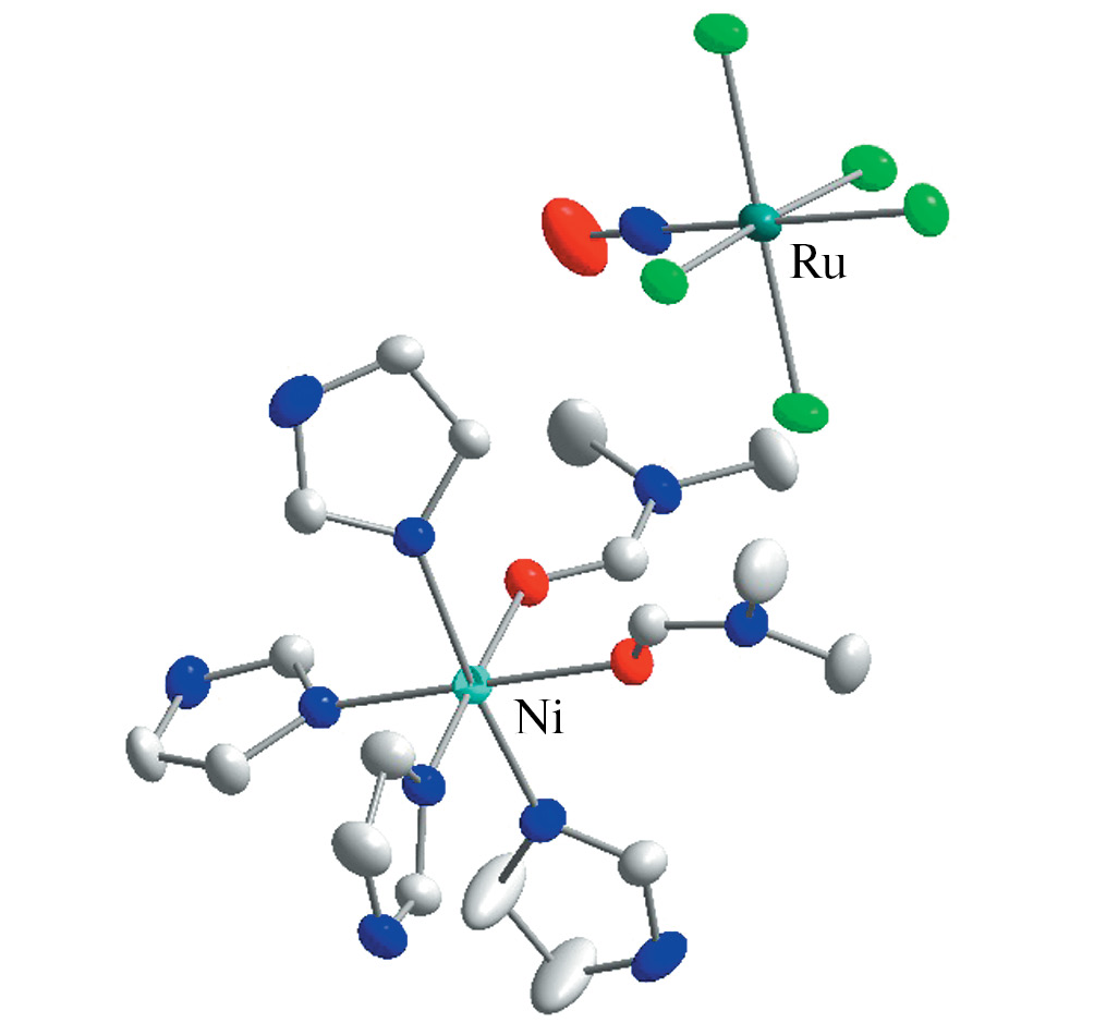 Обнаружено, что комплекс [Ni(im)6][RuNOCl5] · H2O хорошо растворим в диметилформамиде (DMF), при этом практически нерастворим в воде, этаноле, изопропаноле и ацетоне. При осаждении монокристаллов из раствора [Ni(im)6][RuNOCl5] · H2O в DMF медленной диффузией изопропанола образуется другая ДКС, в которой два имидазольных лиганда замещены на молекулы DMF: цис-[Ni(im)4(DMF)2][RuNOCl5], структура которой также установлена методом РСА.