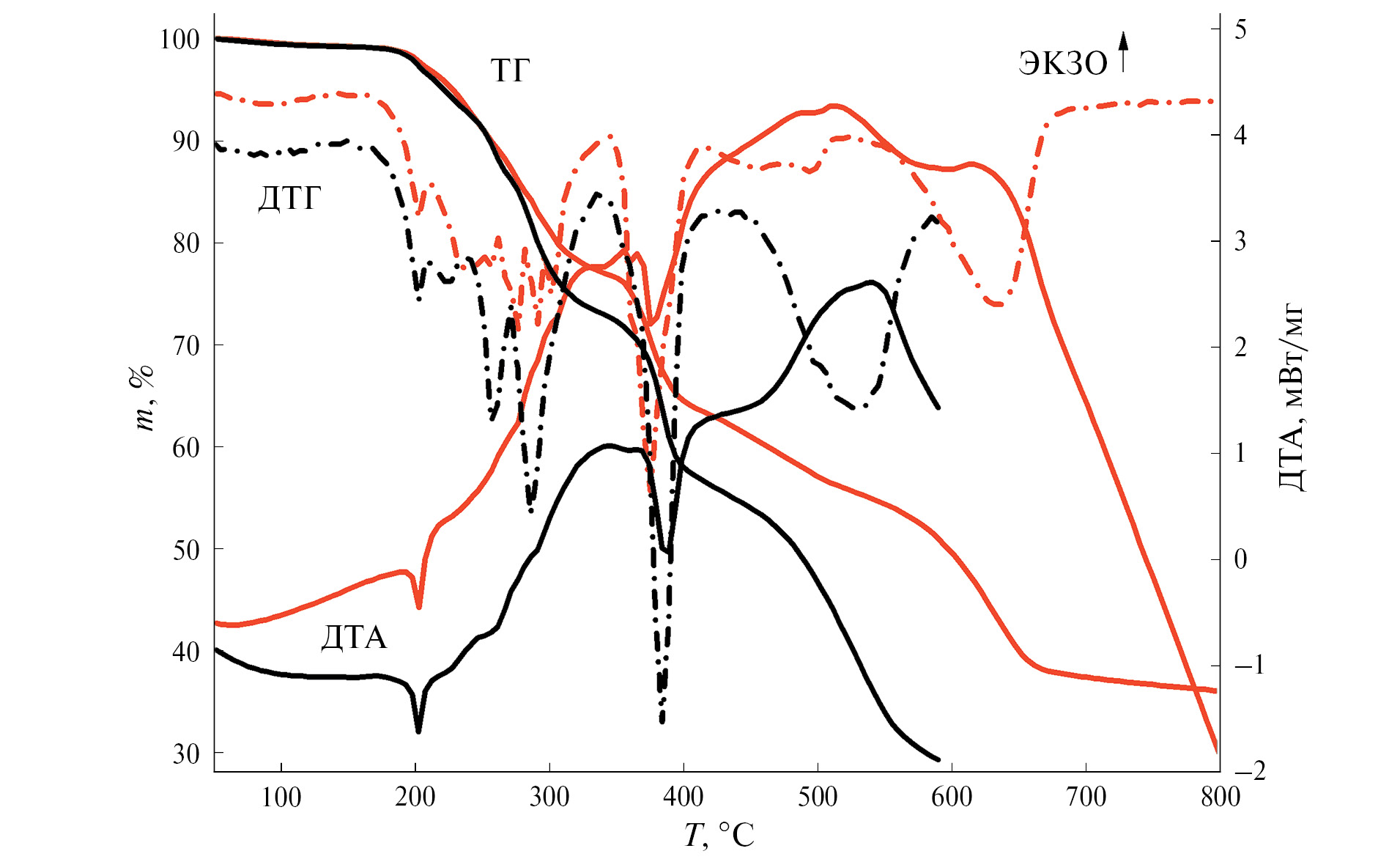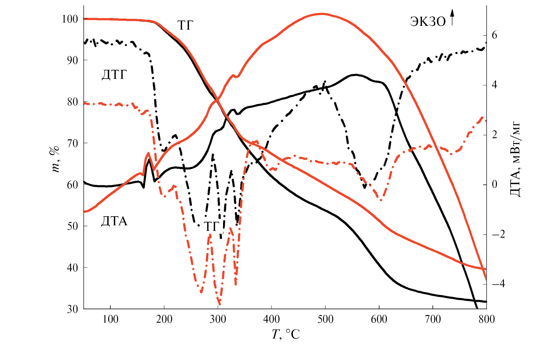 Синхронный термический анализ, который включал одновременное проведение термогравиметрических исследований с дифференциальным термическим анализом (ДТА) и масс-спектрометрическим анализом выделенного газа, проводили на приборе STA 449F1 Jupiter, совмещенном с квадрупольным масс-спектрометром QMS 403D Aëolos (Netzsch, Германия). Ионизацию электронным ударом с энергией 70 эВ, ионные токи для выбранных соотношений масса/заряд (m/z) анализировали в режиме MID с временем регистрации 0.1 с для каждого канала. Эксперименты проводили в атмосфере гелия или гелий-водородной смеси (10 об. % H2 в He, 30 мл/мин). Использовали тигли из Al2O3, скорость нагрева составляла 10 град/мин в диапазоне температур 30–800°С. Масса навески ~10 мг. Обработку экспериментальных данных проводили с использованием пакета программ Proteus analysis.