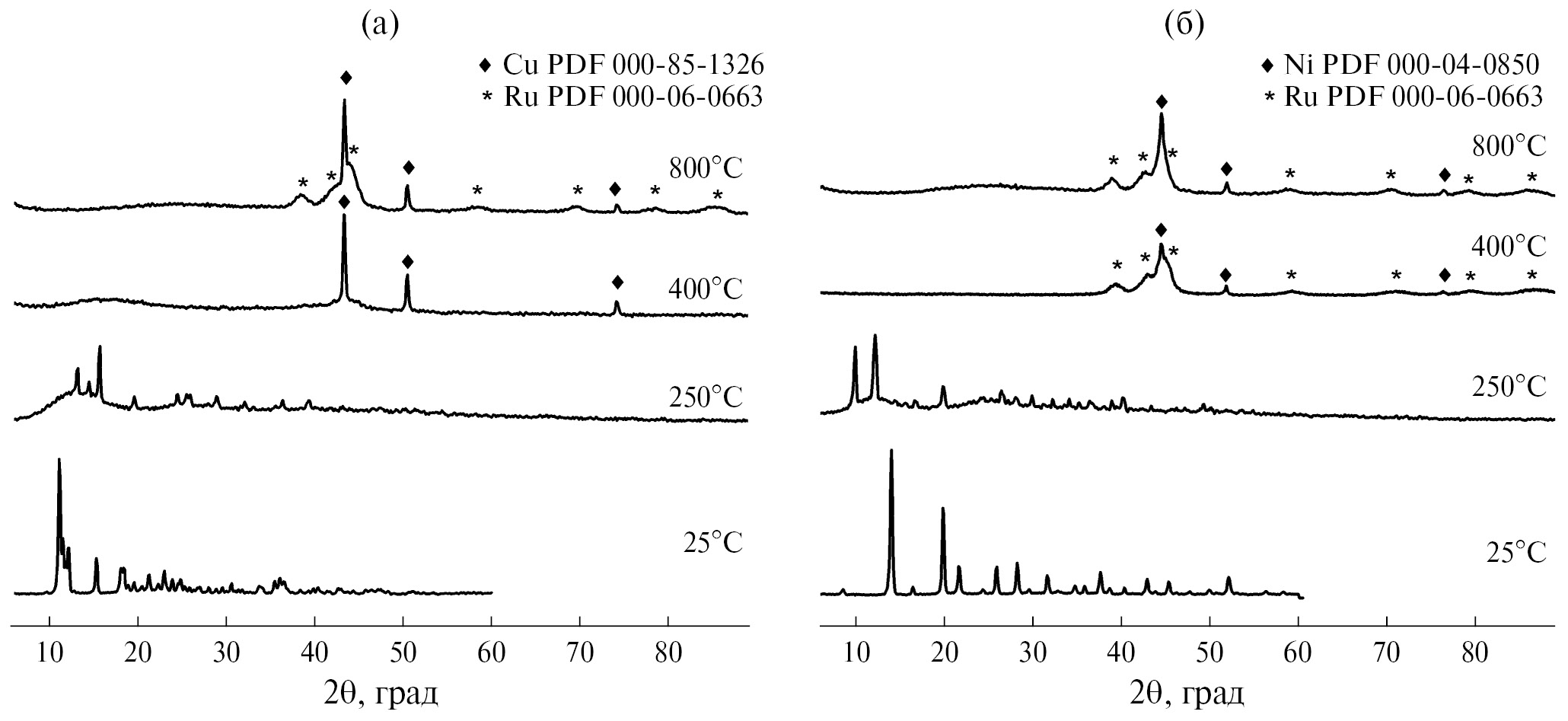 Рис. 6. Экспериментальные дифрактограммы продуктов термического разложения ДКС [Cu(im)4][RuNOCl5] (a) и [Ni(im)6][RuNOCl5] · H2O (б) в атмосфере водорода при различных температурах