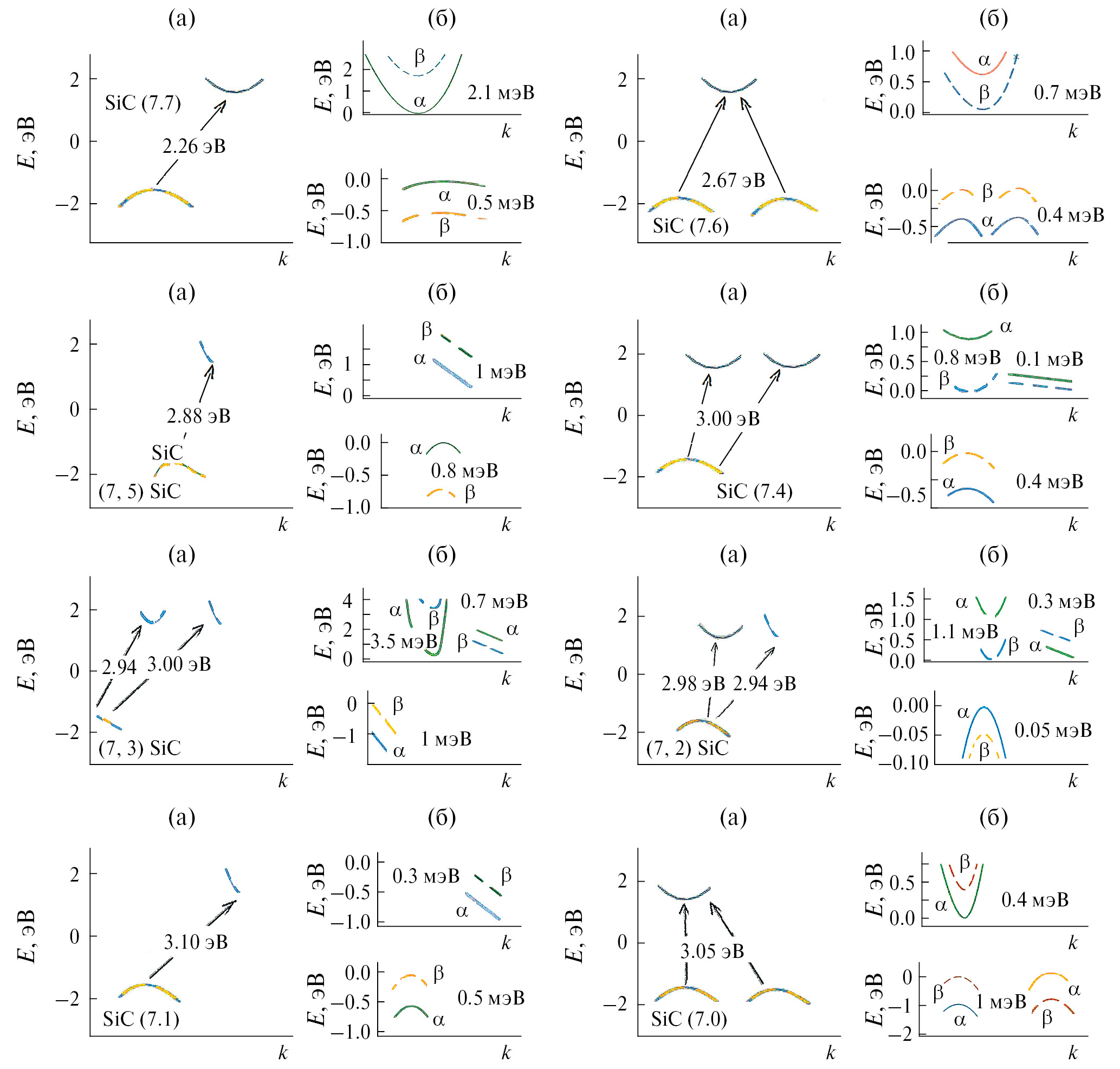 Результаты расчетов электронных и спиновых состояний для остальных нанотрубок SiC (7, n2) приведены на рис. 3. Здесь мы ограничились изображением наиболее актуальной области края запрещенной зоны, положительными значениями вектора k и правовинтовыми нанотрубками, поскольку результаты для k < 0 и левовинтовых трубок легко получаются из этих данных с помощью соотношений (4) и (5).