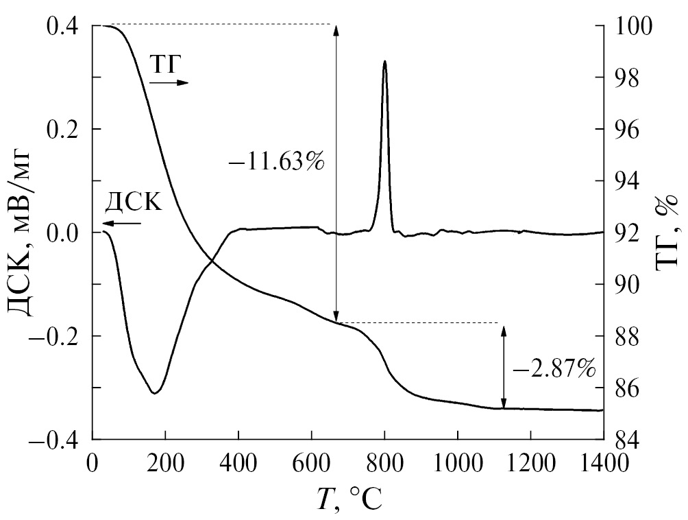 Синтез проводили методом обратного осаждения. Для этого сульфат титанила растворяли в воде, а оксид тулия – в соляной кислоте. Моляльную концентрацию металлов в растворах в пересчете на оксиды определяли весовым методом, осаждая гидроксиды титана и тулия водным раствором аммиака с последующим высушиванием и прокаливанием до температуры 1000°C. Для получения стехиометрического соотношения металлов в рабочем растворе смешивание рассчитанных количеств исходных растворов проводили весовым методом. (Применение моляльных концентраций, во-первых, обусловлено возможностью использовать более концентрированные растворы за счет того, что точность взвешивания значительно превышает точность определения объема, во-вторых, моляльные концентрации не зависят от температуры.) Приготовленный раствор по каплям при интенсивном перемешивании приливали к концентрированному раствору аммиака, взятому в избытке. Осадок отмывали, центрифугировали и высушивали при 90°C в течение 72 ч. Затем проводили ступенчатый отжиг с выдержкой образца на финальной стадии при температуре 1500°C в течение 4 ч для формирования структуры пирохлора. Температуры ступеней отжига определяли по результатам ДСК/ТГ, полученным на установке синхронного термического анализа STA 449F1 Jupiter (рис. 1).