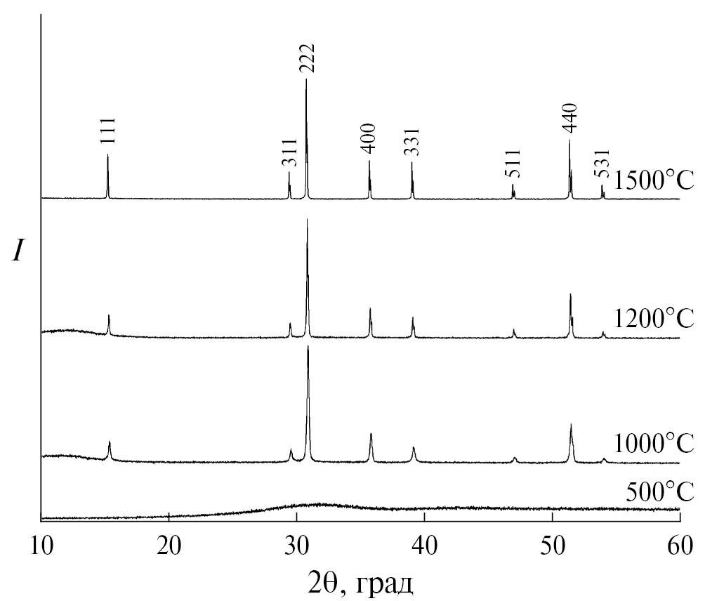 Рис. 2. Рентгеновская дифракция образцов прекурсора Tm2Ti2O7, отожженных при 500, 1000, 1200 и 1500°С