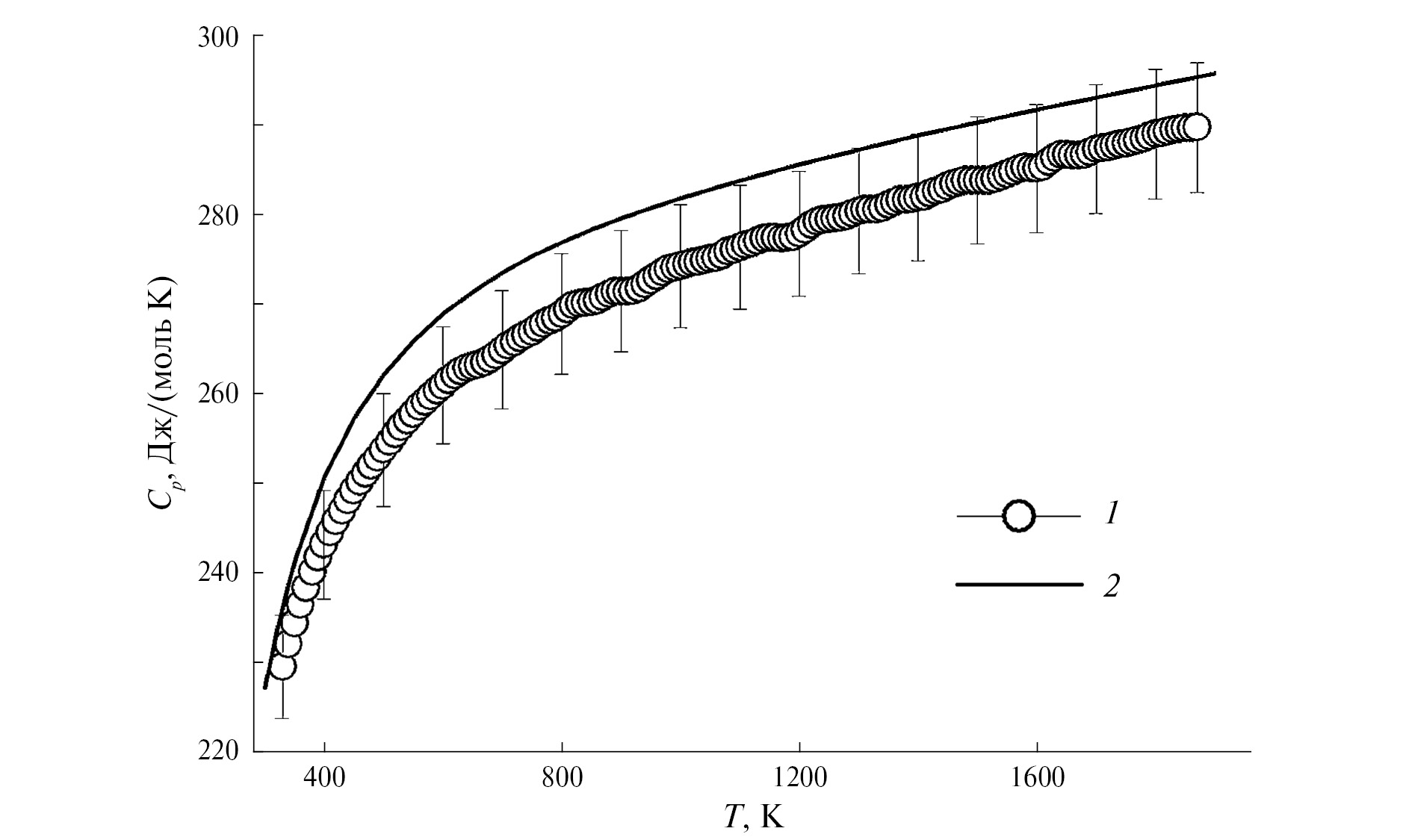 Рис. 6. Молярная теплоемкость Tm2Ti2O7: 1 – измеренная методом ДСК и 2 – рассчитанная по Нейману–Коппу из теплоемкостей простых оксидов