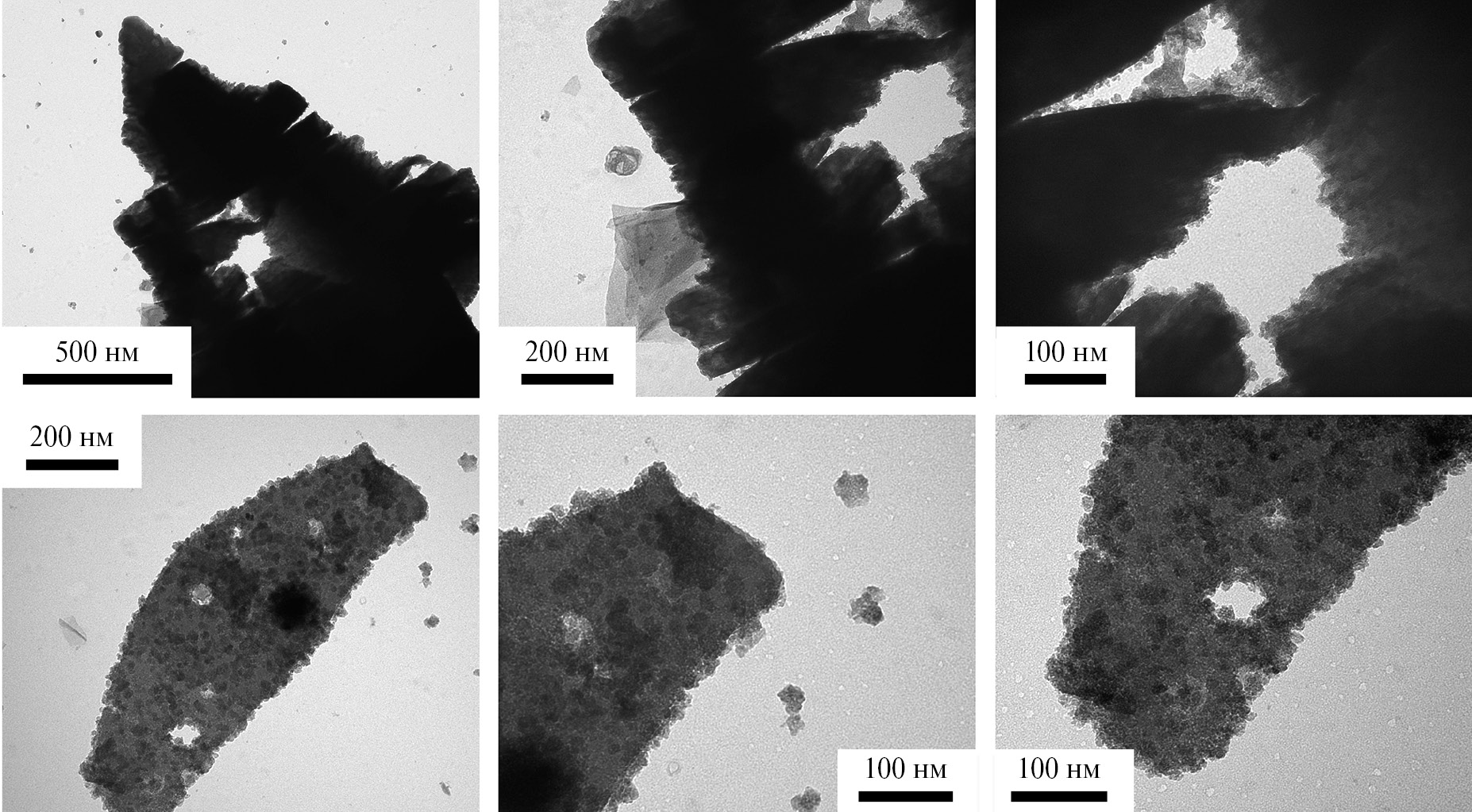 Как видно из рис. 1, агрегаты аккордеоноподобного максена Ti2CTx имеют достаточно широкий интервал размеров: диаметр стопок слоев варьирует от 120 нм до ~1.2 мкм, толщина – от 300 нм до ~2 мкм. При этом на основании анализа микроструктуры встречающихся малослойных частиц можно сделать вывод, что отдельные слои максенов имеют дефекты в виде круглых отверстий, вероятно, унаследованных от структуры исходной МАХ-фазы.