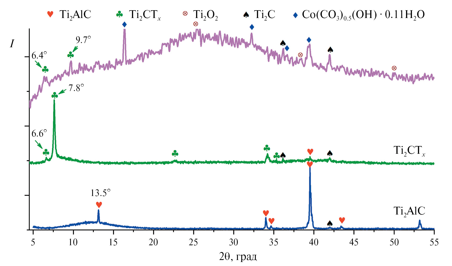 Данные о свойствах нанокомпозитов на основе двумерного карбида титана Ti2CTx встречаются в литературе гораздо реже, чем для Ti3C2Tx, а для модифицированного неорганическими соединениями кобальта в открытой печати нами не найдены.