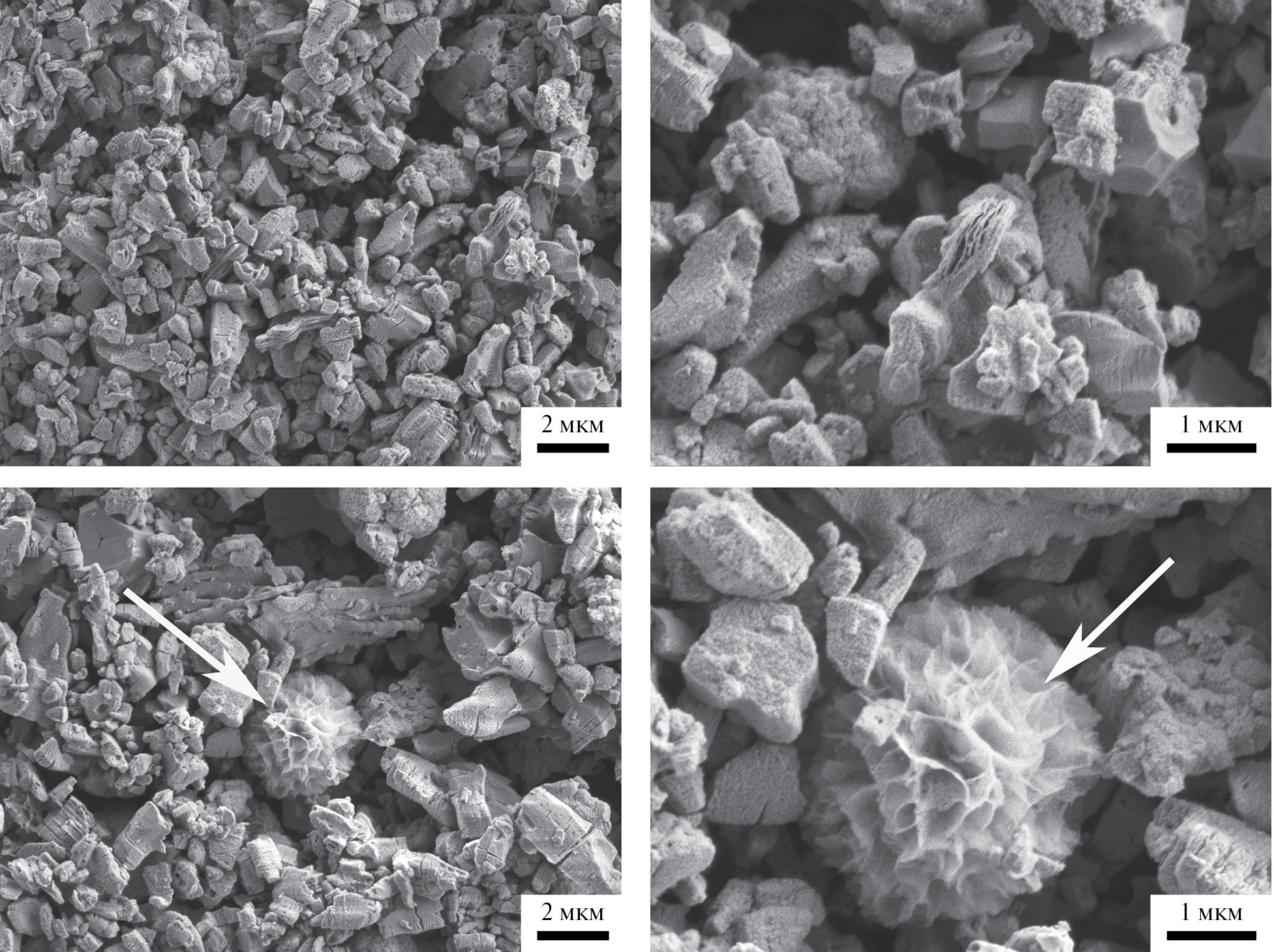 Рис. 6. Микроструктура композиционного покрытия Ti2CTx–Co(CO3)0.5(OH) ⋅ 0.11H2O, нанесенного методом микроплоттерной печати, по данным РЭМ; стрелками указаны включения Co(CO3)0.5(OH) ⋅ 0.11H2O