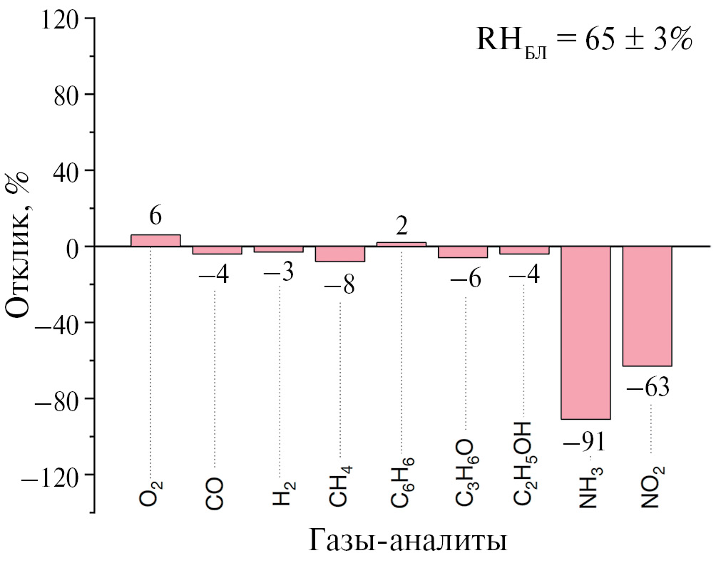 Для него изучена чувствительность к широкой группе газов-аналитов: 50 ppm CO, C6H6, C3H6O, C2H5OH, 2500 ppm H2, CH4, 5% O2 и 40 ppm NH3, NO2; на рис. 7 представлена диаграмма селективности. При напуске того или иного аналита наблюдалось увеличение (О2 и C6H6) или уменьшение (CO, NH3, NO2, C3H6O, H2, CH4, O2 и C2H5OH) электрического сопротивления, что обусловлено различными механизмами детектирования. На диаграмме селективности это изменение отображено с помощью знаков “+” и “–”. Знак “+” соответствует увеличению электрического сопротивления, знак “–” – уменьшению. Как видно из рис. 7, с увеличением сопротивления достигается отклик на О2 и C6H6, а с уменьшением – на все остальные газы.