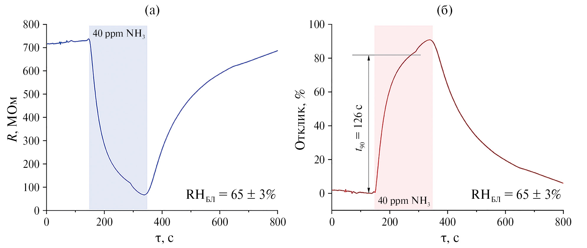 Резюмируя, можно сказать, что из всех анализируемых газов наибольший отклик (91 и 63%) рецепторного слоя Ti2CTx–Co(CO3)0.5(OH) ⋅ 0.11H2O, допированного наночастицами TiO2, зафиксирован на 40 ppm NH3 и NO2 соответственно, что характерно для хемосенсорных материалов на основе максенов и их композитов с полупроводниковыми оксидами металлов. На рис. 8 представлены данные по изменению сигнала при напуске 40 ppm NH3: наблюдается уменьшение электрического сопротивления (рис. 8а), что соответствует высокому отклику в размере 91% (рис. 8б). Расчетное значение времени отклика (τ90) составило порядка 126 с. Стоит отметить, что полученное значение величины отклика на аммиак в комнатных условиях при повышенной влажности является достаточно высоким для всех классов хеморезистивных материалов. В предыдущих исследованиях, связанных с частичным окислением многослойного Ti2CTx путем термической обработки на воздухе [43, 66], нами был показан близкий эффект: при относительной влажности 50–55% и комнатной температуре наблюдались отклики на большие концентрации (100 ppm) этих газов величиной 60–61 и 41–54% соответственно. Вероятно, это связано как с более высокой удельной площадью поверхности, так и с эволюцией формирования наночастиц TiO2 на поверхности максена.