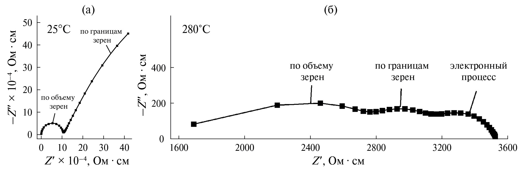 Рис. 4. Импеданс-спектры (Mg0.2Cu0.2Ni0.2Co0.2Zn0.2)Nb2O6 при 25 (а) и 280°С (б) на воздухе.