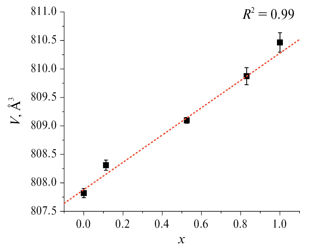 Подтверждением образования твердых растворов неорганических соединений является линейная зависимость между параметрами элементарной ячейки (ее объема) от состава [42]. Для МОК-ВС такие зависимости строят очень редко из-за трудностей при уточнении параметров элементарной ячейки для низкосимметричных систем, характеризующихся высокими значениями объема элементарной ячейки. Для твердых растворов МОК-ВС известны как линейные зависимости объема элементарной ячейки от состава [22, 43–46], так и положительные [47] или отрицательные отклонения от линейной зависимости [48, 49]. Наиболее часто факт образования твердых растворов доказывают косвенными или неадекватными методами (рентгеновская фотоэлектронная спектроскопия, локальный рентгеноспектральный микроанализ, ИК-спектроскопия, атомно-эмиссионный с индуктивно связанной плазмой анализ, растровая просвечивающая электронная микроскопия) [9, 27, 50, 51]. В редких случаях уточняют структуру ближайшего окружения металлоцентров методами EXAFS [9, 52].