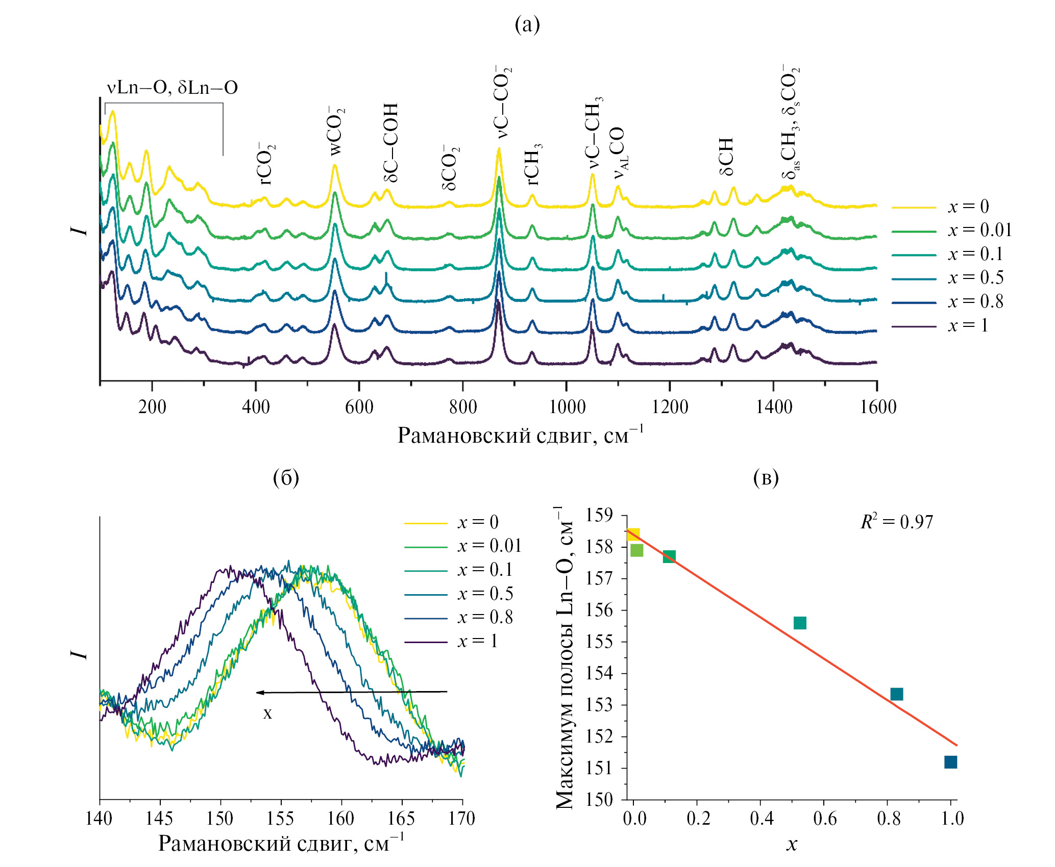 Анализ полученных нами данных показывает (табл. 3), что в зависимости от состава лактатов иттрия-диспрозия [Y1–xDyx(C3H5O3)3(H2O)2] наблюдается изменение (до 7 см–1) положения полосы с максимумом в области 150–160 см–1 (рис S2). Эту полосу можно отнести к одной из мод колебаний кислородного полиэдра LnO8 в составе молекулярного лактата иттрия-диспрозия (табл. 3). На рис. 4б приведен вид указанной полосы для составов [Y1–xDyx(C3H5O3)3(H2O)2], где x = 0, 0.01, 0.1, 0.5, 0.8 и 1, при этом положение данной полосы практически линейно зависит от коэффициента x (рис. 4в), что можно связать с изменением силовой константы колебания Ln–O при замене катионов иттрия на более тяжелые катионы диспрозия. Полученный результат может служить дополнительным доказательством образования твердых растворов в анализируемой системе.