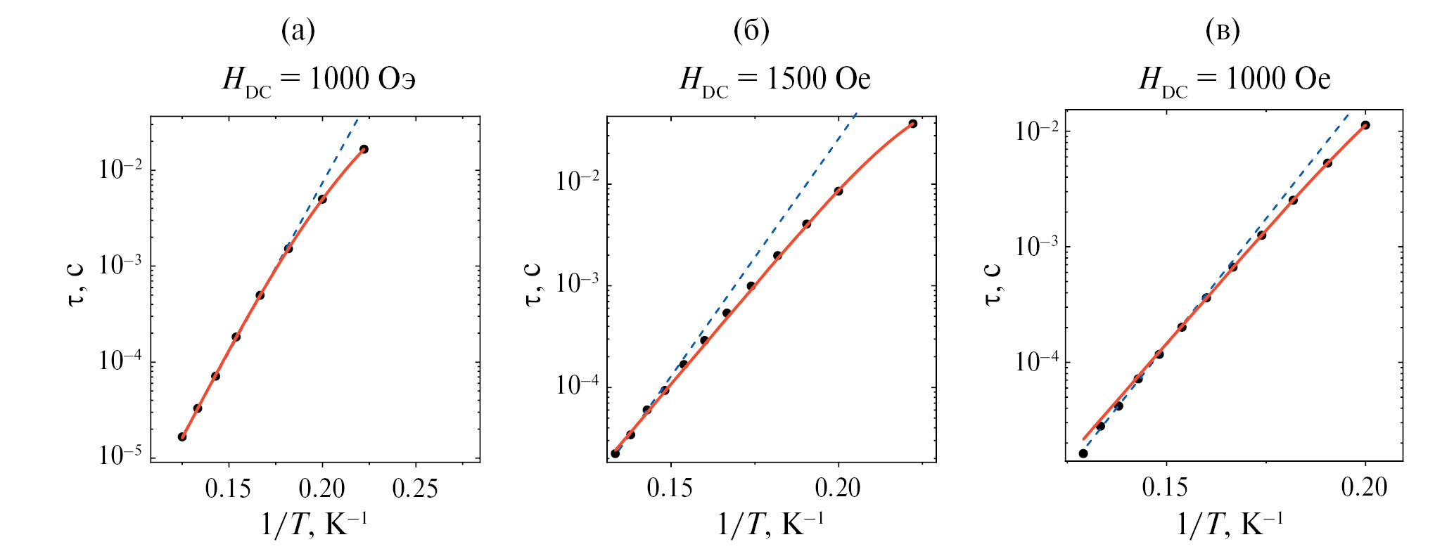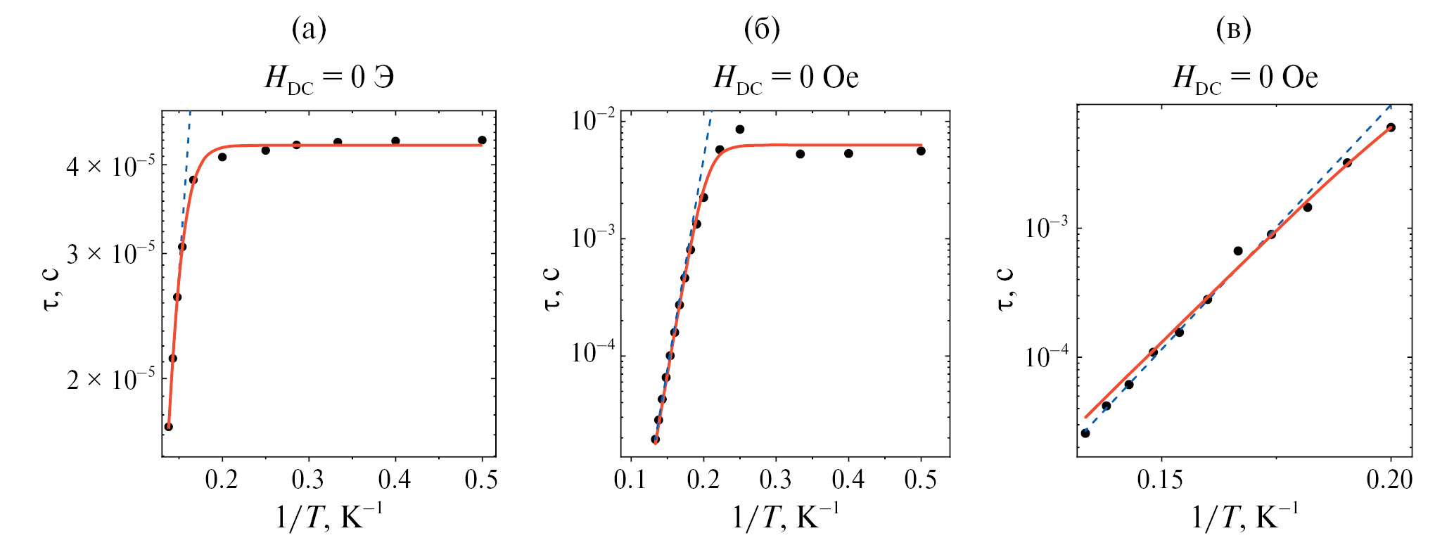 Зависимости τ(1/T) для [Y0.99Dy0.01(C3H5O3)3(H2O)2] в нулевом (рис. 6в) и оптимальном (рис. 7в) поле практически совпадают. Для [Dy(C3H5O3)3(H2O)2] (рис. 6а) и [Y0.9Dy0.1(C3H5O3)3(H2O)2] (рис. 6б) в нулевом магнитном поле при температурах до 5 K релаксация сильно подавляется квантовым туннелированием, а для [Y0.99Dy0.01(C3H5O3)3(H2O)2] (рис. 6в) влияние квантового туннелирования существенно меньше. В аппроксимации механизмом Орбаха (табл. 5) для всей серии [Y1–xDyx(C3H5O3)3(H2O)2] значения барьера перемагничивания возрастают (40.6–108 K) при подавлении КТН в магнитном поле, но в случае [Y0.99Dy0.01(C3H5O3)3(H2O)2] разрыв между ΔE/kB (13 K) при нулевом и оптимальном постоянном поле ниже, чем для [Y0.9Dy0.1(C3H5O3)3(H2O)2] (25.1 K) и [Dy(C3H5O3)3(H2O)2] (53.4 K). Полученные результаты указывают на то, что среди синтезированных твердых растворов наиболее эффективное магнитное разбавление достигнуто для кристаллов [Y0.99Dy0.01(C3H5O3)3(H2O)2].