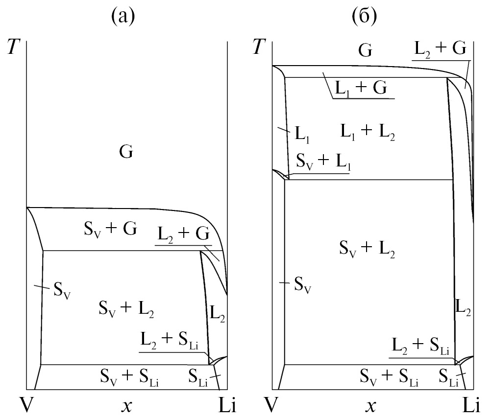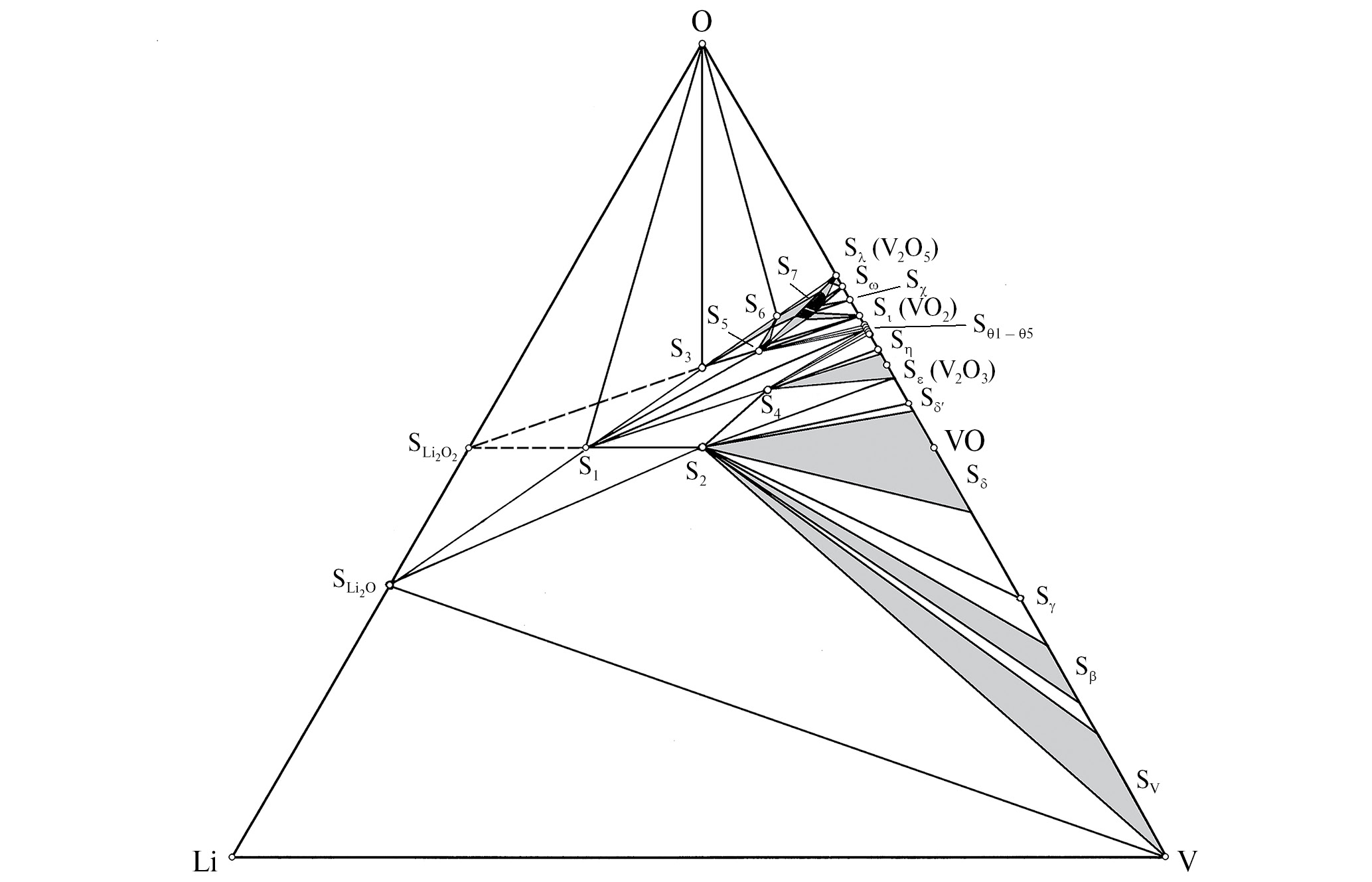 Практически все кристаллические фазы, образующиеся в системе Li–V–O, представляют собой ограниченные твердые растворы, на гомогенность которых влияют не только температура и давление, но и фазы, находящиеся с ними в равновесии. Рассмотрим фазовые диаграммы тройной системы Li–V–O, начиная с граничных бинарных систем.