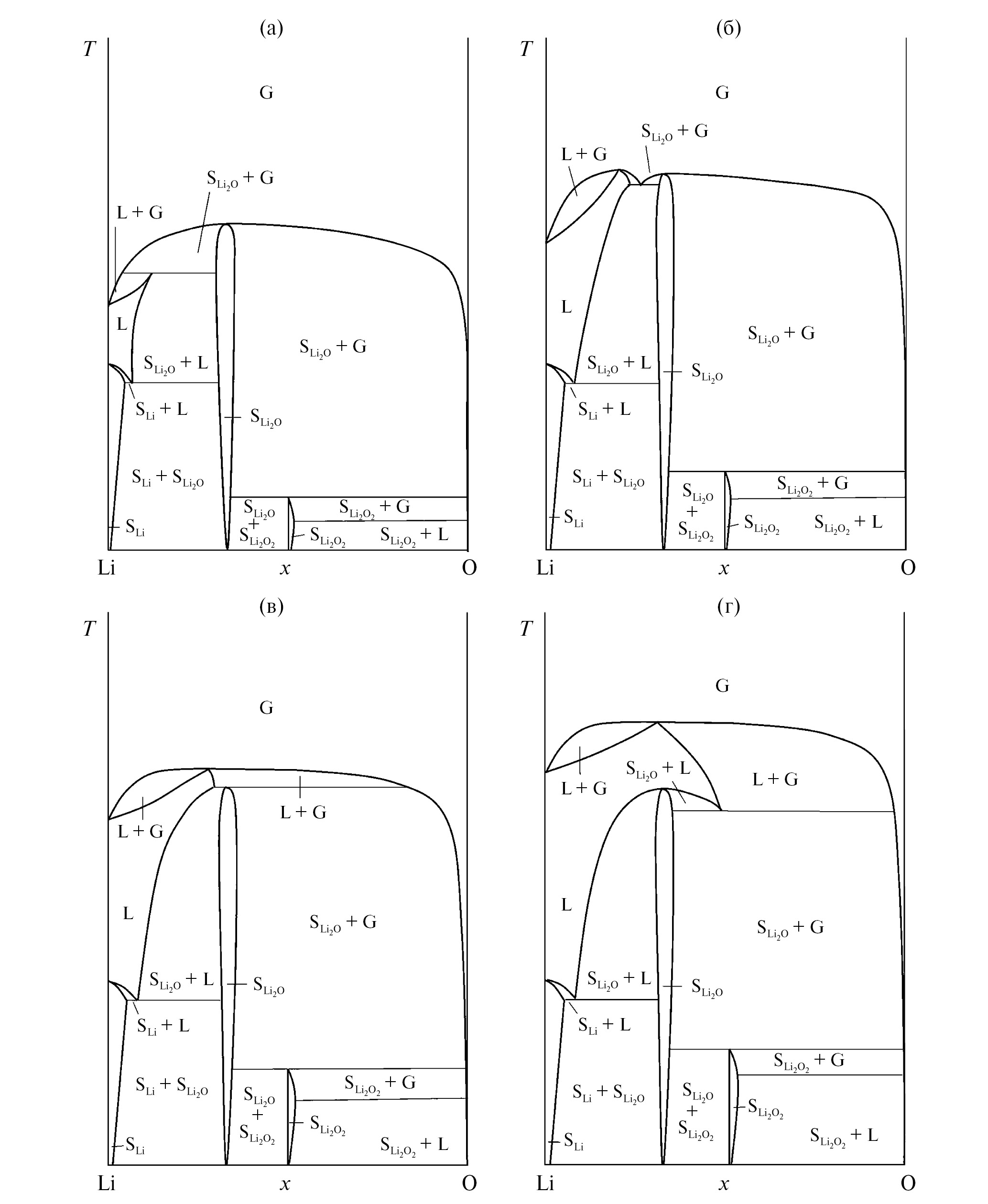 Рис. 4. Изобарные T–x-сечения P–T–x-фазовой диаграммы Li–O: интервалы POLi < P < PN1 (а), PN1 < P < PN2 (б), PN2 < P < PN3 (в) и PN3 < P < PP (г).