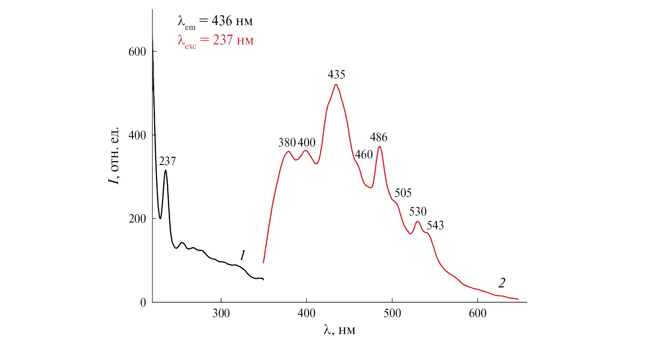 Экситонные и эмиссионные спектры образца Ba2YCu0.5Mo0.5O6–δ приведены на рис. 4. Полоса поглощения при 237 нм (λem = 436 нм) на экситонном спектре (рис. 4, кривая 1) подтверждает перенос заряда O2– → Cu2+. Полосы люминесценции (λexc = 237 нм) в интервале 350–550 нм (рис. 4, кривая 2) определяются переходами 1T1,1T2,3T1,3T2 → 1A1 для аниона [MoO4]2– [19–22] и диффузией кислорода в структурных плоскостях CuO2 основных фаз (Fmm и F3m) и примесной фазы YBa2Cu3O7–x (Pmmm): λ = 435, 530 нм [23], λ = 460 и 486 нм [24]. Положение люминесцентных полос даже в случае двойного оксида BaMoO4 зависит от размеров и условий получения поликристаллов [25–27].