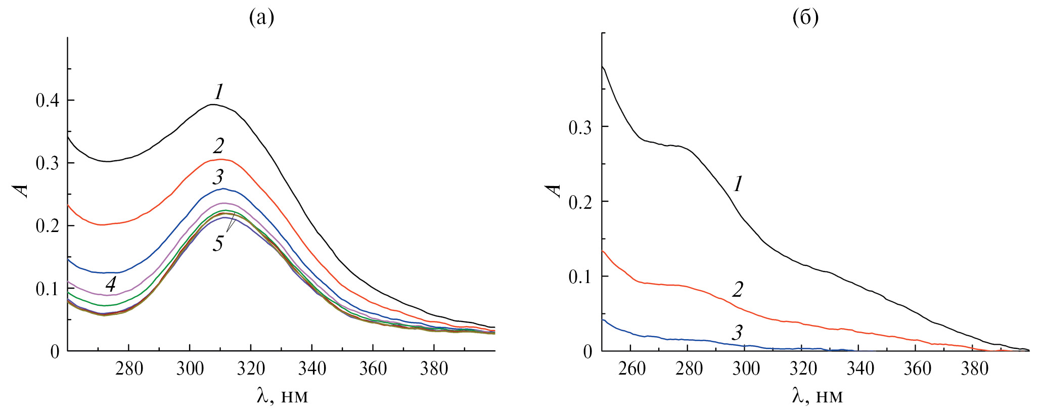 Рис. 1. Изменение во времени УФ-спектра раствора при взаимодействии AuCl4– с метионином (CAu = 1.0 × 10–4 моль/л, pH 2, l = 1 см): а – CHMet = 6.0 × 10–5 моль/л, время после смешения τ = 6 c (1), 30 с (2), 1 мин (3), 1 мин 30 с (4), 2–30 мин (5); б – CHMet = 5.0 × 10–4 моль/л, время после смешения τ = 8 c (1), 30 с (2), 1 мин (3).