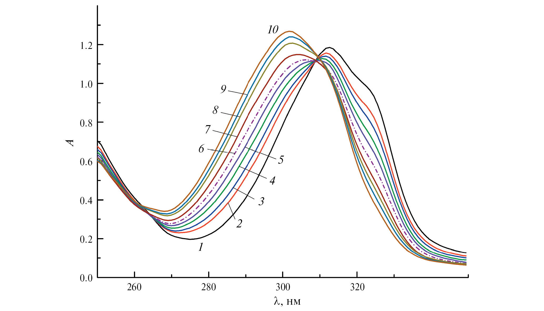 Рис. 2. Изменение во времени УФ-спектра раствора при взаимодействии Au(bipy)Cl2+ с HMet. CAu = 1.0 × 10–4 моль/л, CHMet = 6.0 × 10–5 моль/л; τ = 5 c (1), 10 (2), 20 (3), 40 (4), 60 (5), 76 (6), 109 (7), 143 (8), 174 (9), 230 мин (10); pH 2.0, l = 1 см.