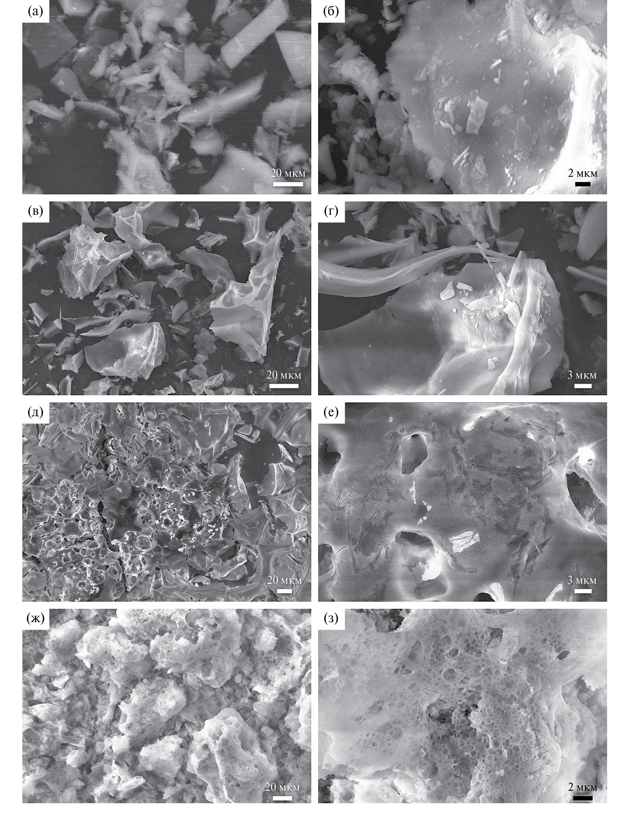 Рис. 2. СЭМ-изображения образцов Al2O3–Ag, синтезированных из прекурсоров с различными органическими компонентами: а, б – ПВС, 850oС; в, г – ПВП, 850oС; д, е – глицин, 850oС; ж, з – глицерин, 850oС.