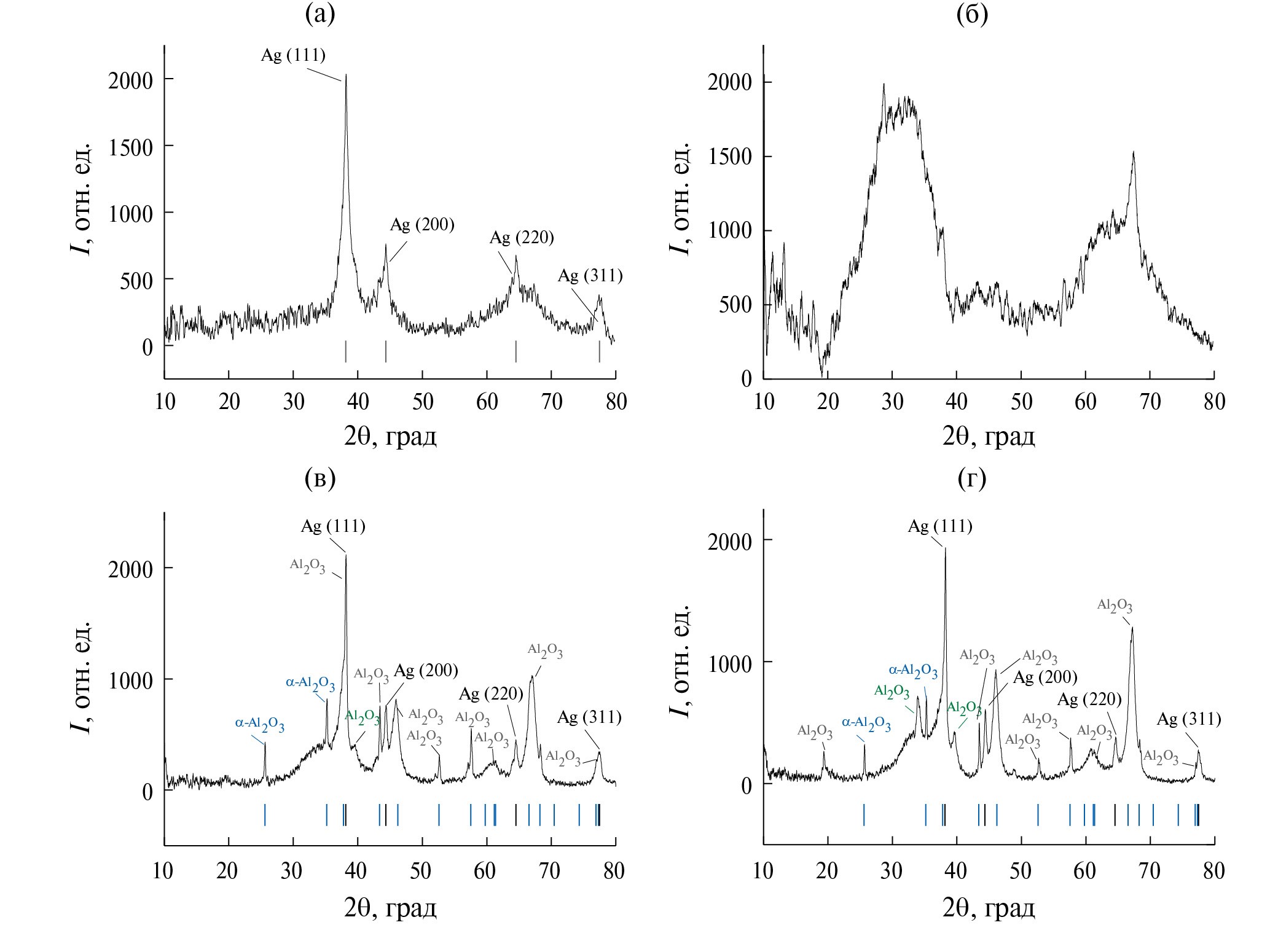 Рис. 5. Рентгенограммы образцов Al2O3–Ag, синтезированных из прекурсоров с различными органическими компонентами: а – ПВС, 650оС; б – ПВП, 650оС; в – ПВС, 850оС; г – ПВП, 850оС (штрихдиаграммами обозначены фазы металлического серебра (COD ID: 1100136) (черный), α-Al2O3 (COD ID: 1000017) (синий)).