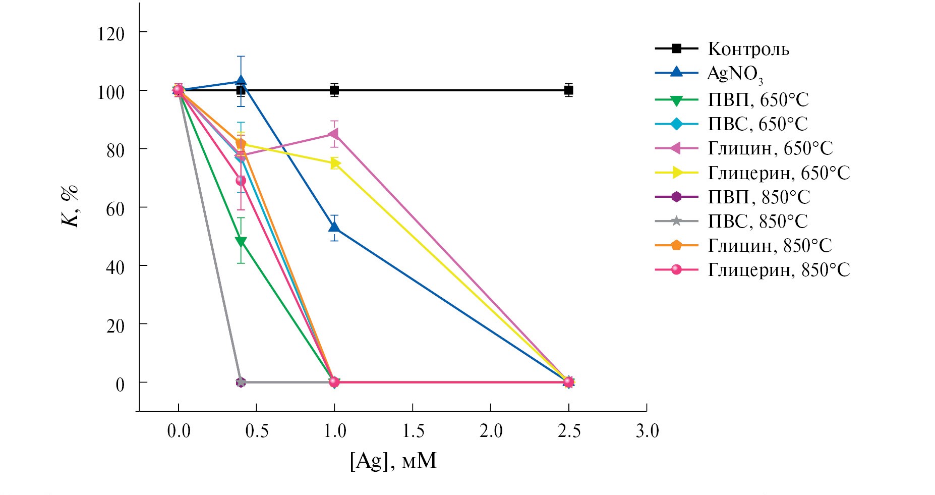 Для оценки антибактериальной активности навеску образца, перетертого в ступке и просеянного через сито, вносили непосредственно в среду для культивирования перед автоклавированием. Образец сравнения – нитрат серебра – вносили после автоклавирования перед разливом сред, когда температура составляла 6–50°С. Для экспериментов брали питательную среду LB без хлорида натрия (10 г/л триптона и 5 г/л дрожжевого экстракта) из 1.5%-ного агар-агара. Автоклавирование проводили в течение 20 мин при 115°С. Использовали культуру кишечной палочки (E. coli), штамм TG-2. Ночную культуру бактерии разводили в 108 раз, после чего 50 мкл разведенной бактериальной суспензии втирали шпателем Дригальского в тестируемую среду – 20 мл в чашке Петри диаметром 10 см. На следующий день проводили подсчет выросших колоний (на участках 3 × 3 см). Измерения повторяли 5 раз. Достоверность отличий от контрольного варианта без введения порошкового образца или нитрата серебра определяли с использованием непараметрического U-критерия Мана–Уитни. Фотографирование проводили на вторые сутки, чтобы колонии были более заметны. Оптимальный объем вносимой культуры и степень ее разведения были подобраны в предварительном эксперименте. Тестируемая концентрация ионов серебра и его наночастиц составляла 0, 0.4, 1.0 и 2.5 мМ/л с учетом его содержания в образцах 10 мас. %.