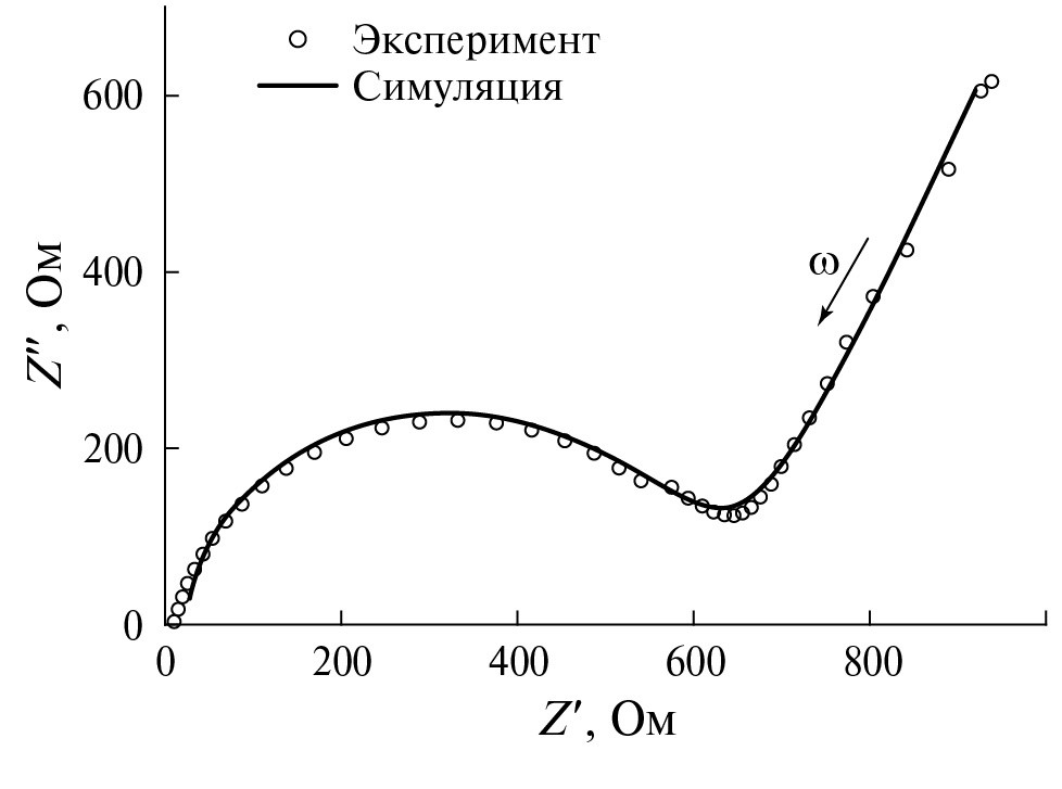 В высокочастотной области спектра годографы импеданса имеют вид искаженной полуокружности с центром, расположенным ниже оси абсцисс (рис. 5, 6), что обусловлено параллельным RC-соединением. Искаженная полуокружность может быть смоделирована различными схемами замещения [33–35]. Выбрана схема, показанная на рис. 7, так как она наиболее точно отражает физическую природу процессов и удовлетворительно моделирует экспериментальные годографы. Данную схему замещения применяли для описания спектра импеданса литиевого электрода в исследованиях [36, 37]. Выбор схемы с импедансом Варбурга является обоснованным для рассматриваемых спектров, поскольку начальная часть высокочастотной области в небольшом интервале линейна, что характерно для диффузионных процессов. Низкочастотная область спектра годографа импеданса в виде наклонной прямой моделируется элементом постоянной фазы (CPE) и связана с возникновением двойного электрического слоя на границе образец–электрод.
