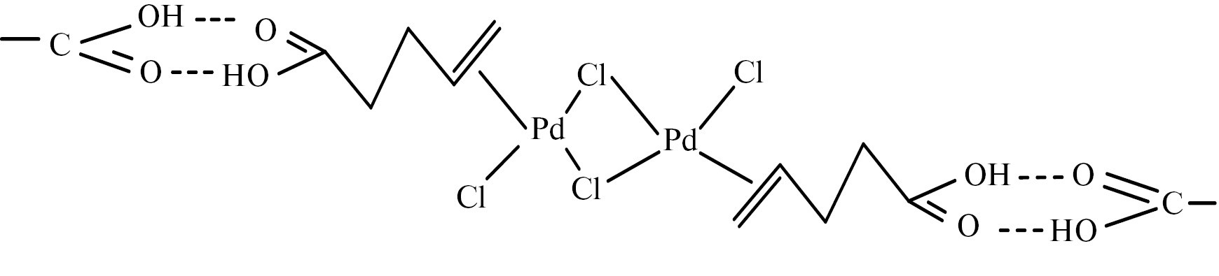 Первые соединения с ненасыщенными монокарбоновыми кислотами – трехъядерные комплексы Pd(II) [Pd3(μ-RCOО)6] – были описаны в работах [27, 28] и получены взаимодействием ацетата Pd(II) с кротоновой, 1-метилкротоновой и циннамовой кислотами с двойными связями, сопряженными с карбоксильной группой, в ароматическом растворителе. Согласно данным элементного анализа, ИК- и КР-спектроскопии, координационный полимер в них формируется мостиковыми карбоксилатными группами. Двойные связи в образовании комплексов не участвуют.