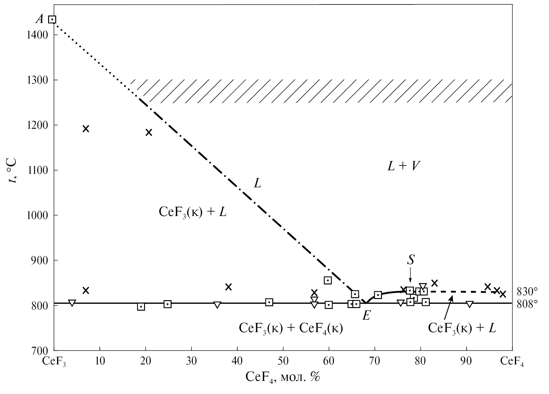 Рис. 1. Адаптированная ориентировочная фазовая диаграмма CeF4–CeF3 [22], где * – точки, полученные в результате термического анализа; s – точки, полученные путем дифференциального термического анализа; х – закаленные составы; //// – область, в которой невозможно описать поведение системы в зависимости от температуры.